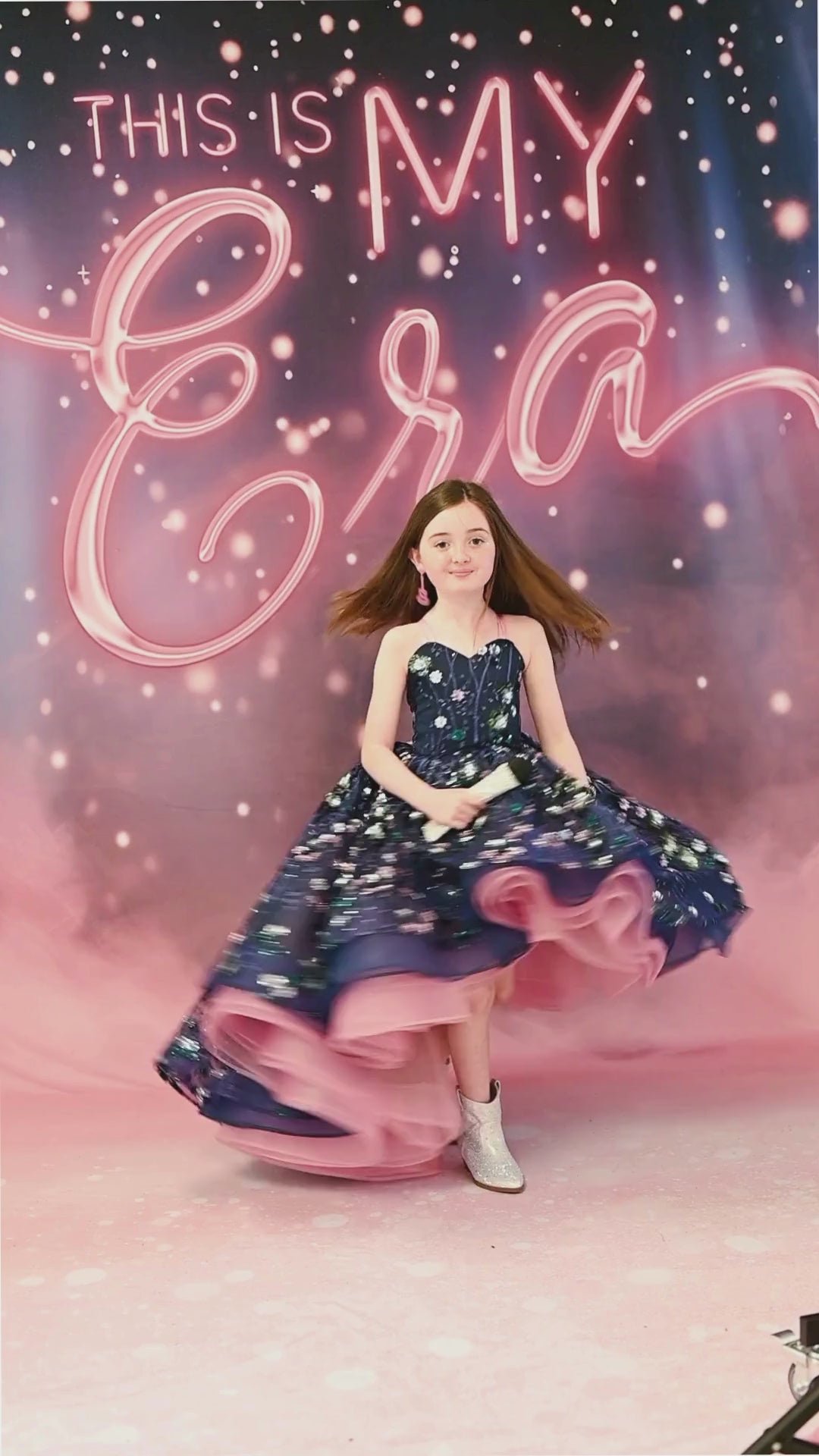 Girl in an orange dress posing against a glittery orange background- Taylor Swift Inspired - LIFE OF A SHOWGIRL9-year-old girl wearing Sparkling Starlet Couture Dress in orange sequins with layered tulle skirt, posing with glitter microphone.