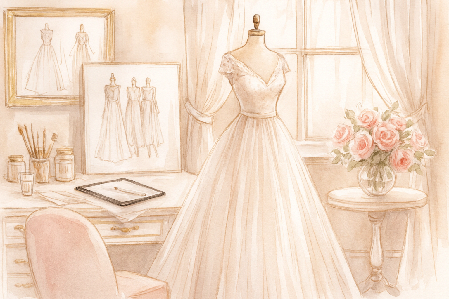 See how our couture gowns come to life — from hand-drawn concepts to breathtaking finished designs.