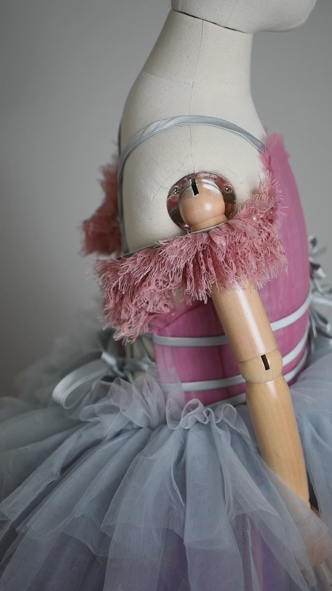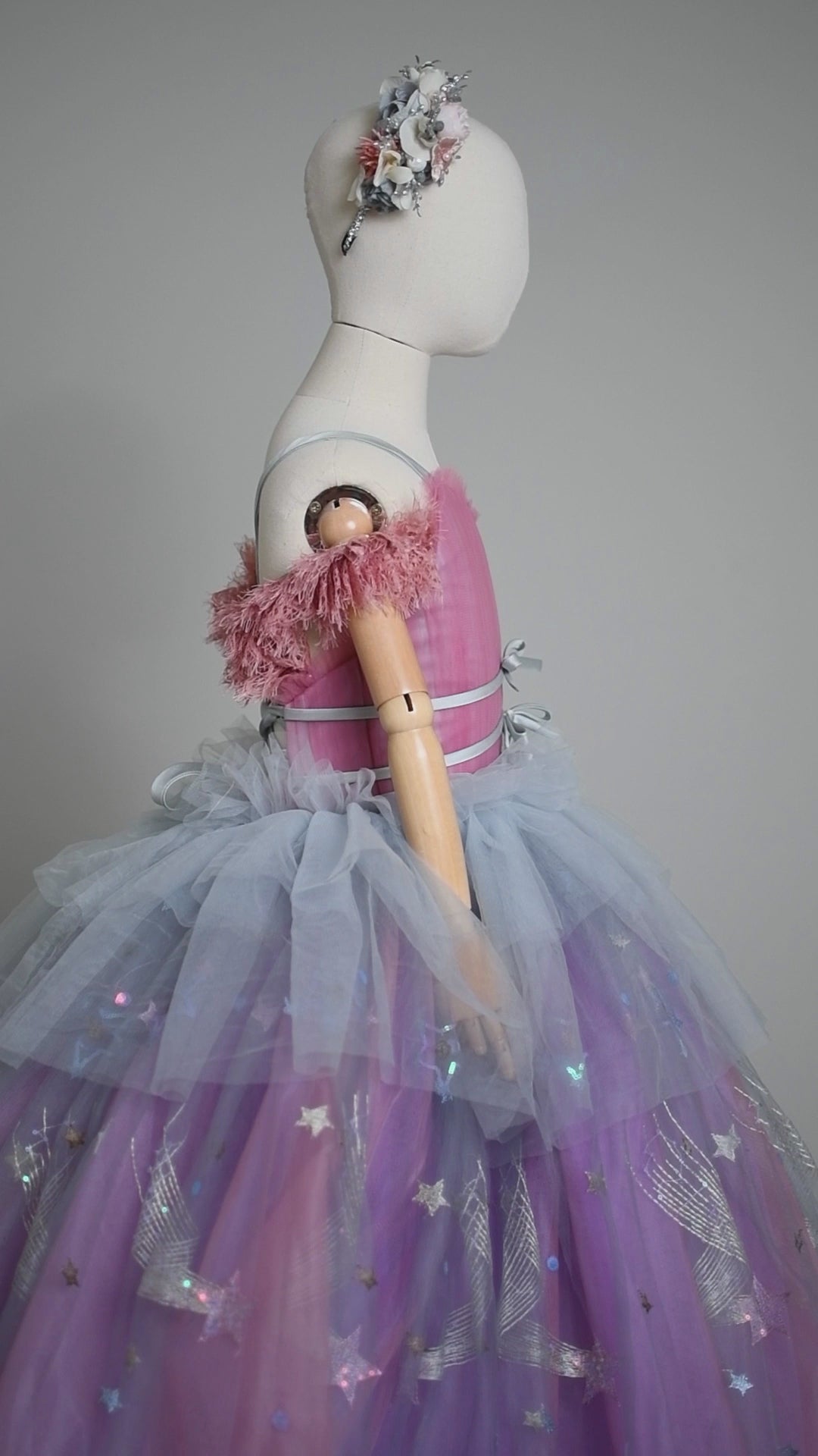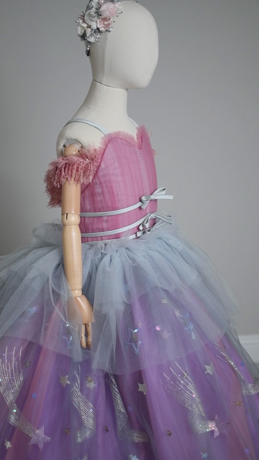 Our "All That Shimmers" gown in Shades of Gray, Pink, and Purple – a dreamy delight filled with charm and sparkle. The beautiful silhouette showcases gorgeous shades of gray, pink, and purple, adorned with 3D star dust fabric that will delight any little one. The sweet bodice features a sweetheart neckline and a hand pleated pink bodice with silver attached belted satin bow detailing. We have added an off shoulder lace detailing to add to her charm.