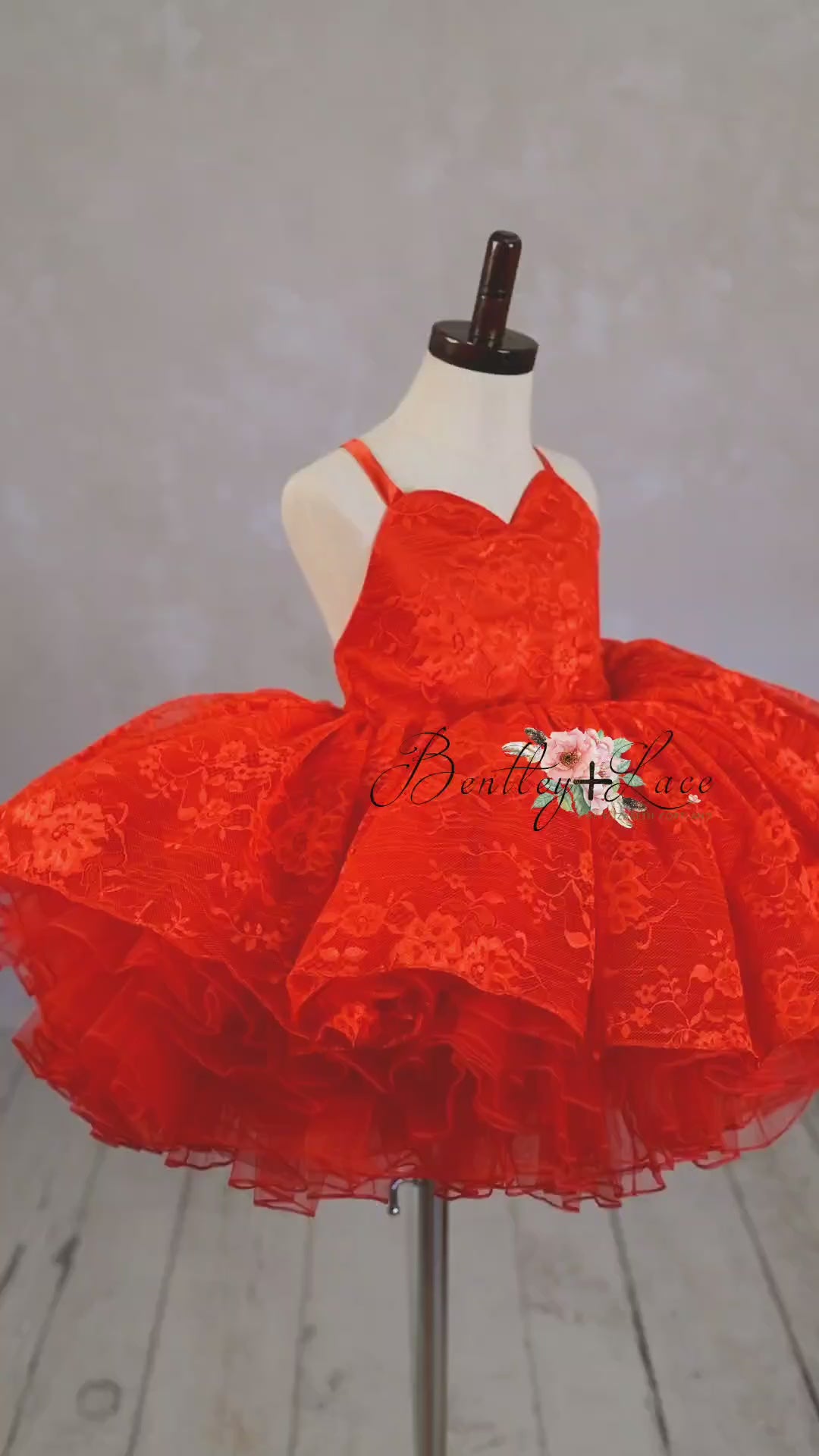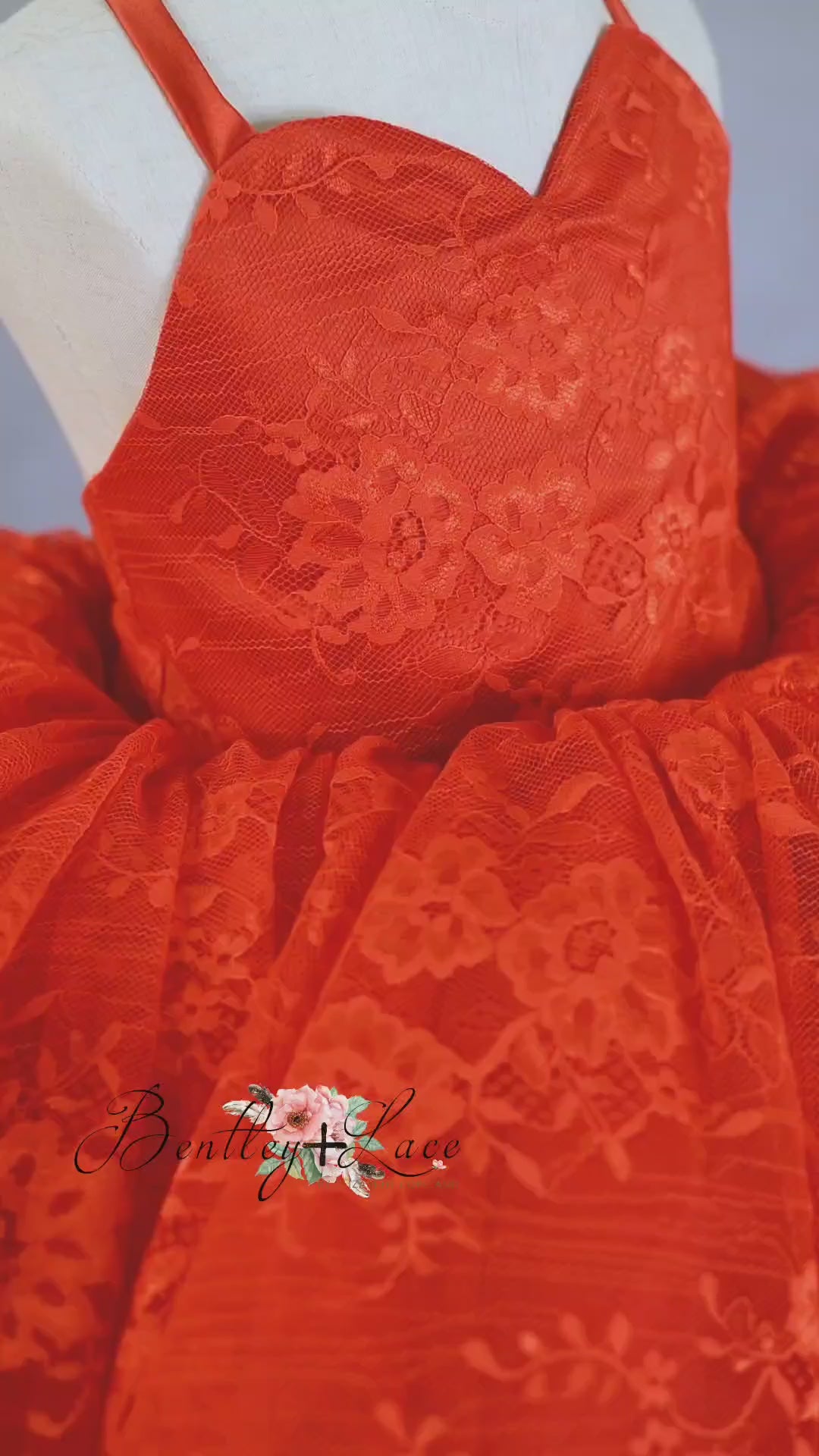 Our Blooming Love petal dress is the perfect shade of red. This simple silhouette is made with beautiful bridal lace and features a very flexible back which features shoulder ties which add to the ease of size adjustment and a full elastic back- which lends to her ease of size adjustment as well. Typically with our elastic back you can add an additional 1-3 inches of room into this dress.