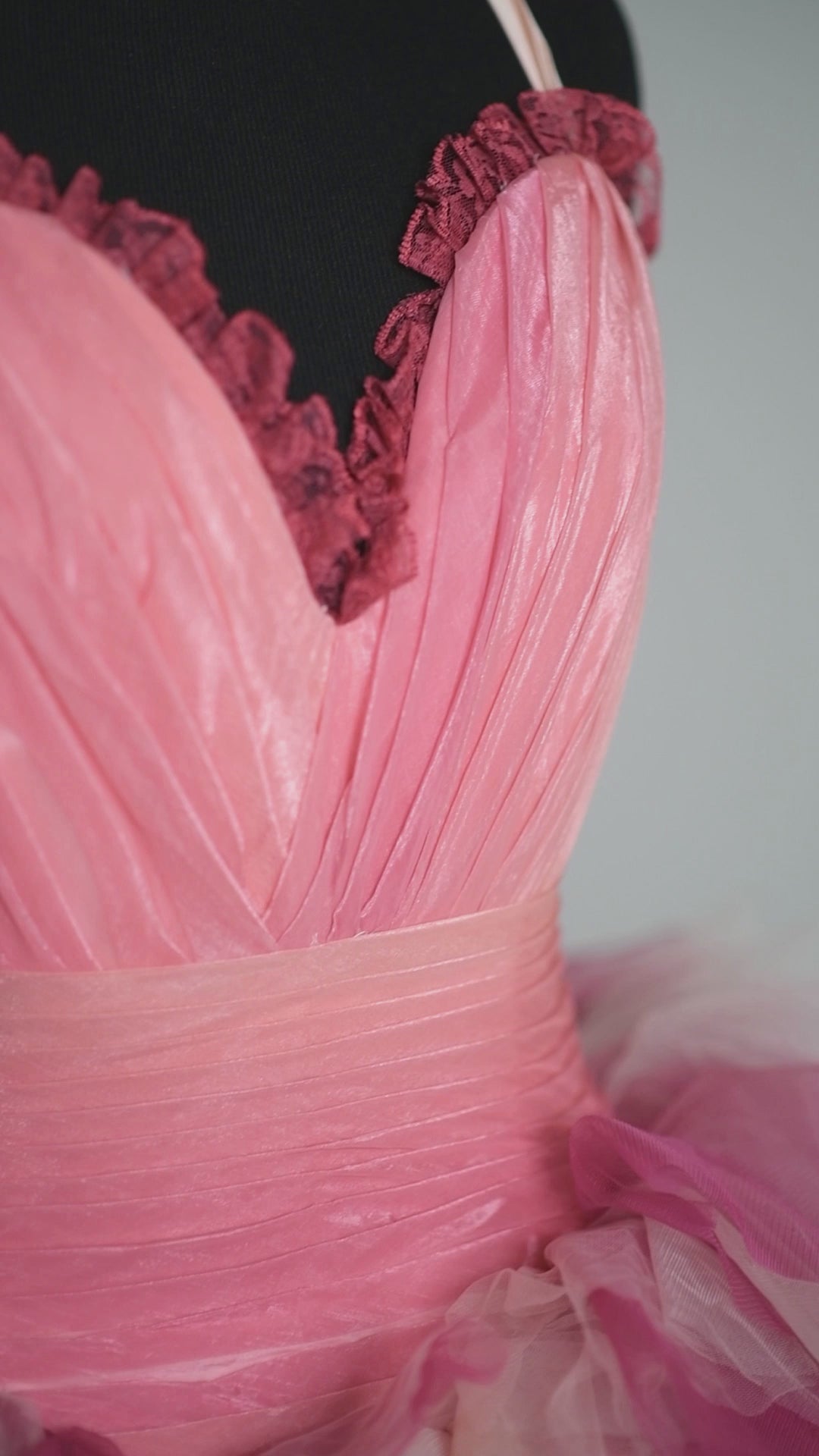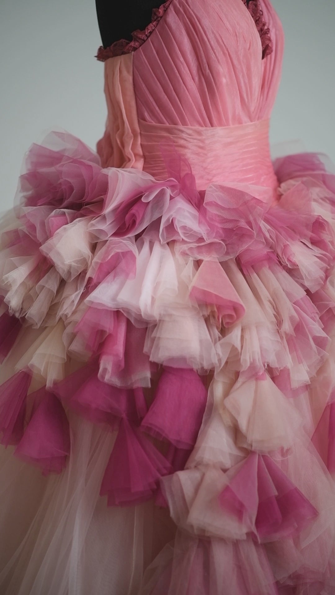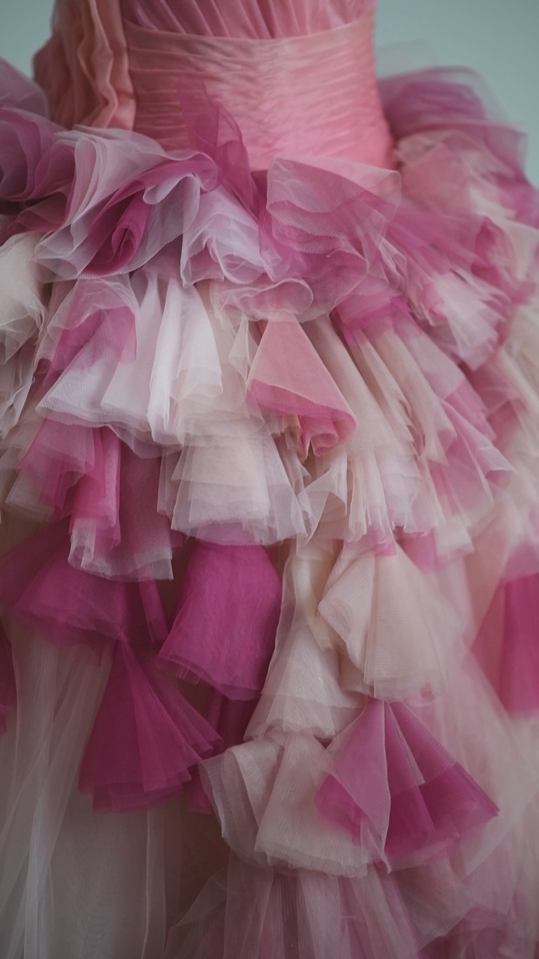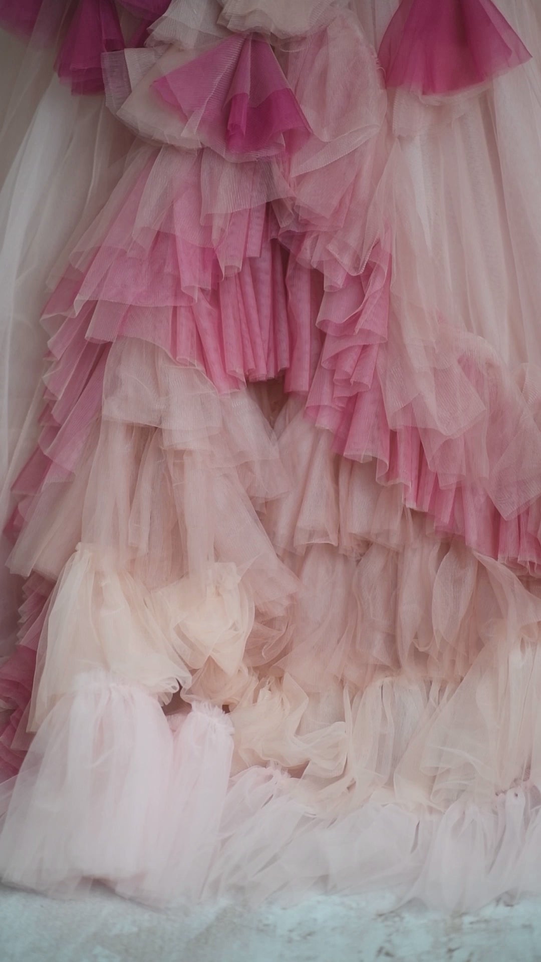 For a perfect fit and an elegant touch, the back features a corseted detail, allowing you to customize the gown according to your preferences. The skirt is a vision of elegance, composed of layers of bridal soft tulle in enchanting hues of mauve, peachy pink, nude, and dusty rose. Handmade ruffled details cascade down the skirt, creating a couture masterpiece that is both captivating and ethereal.