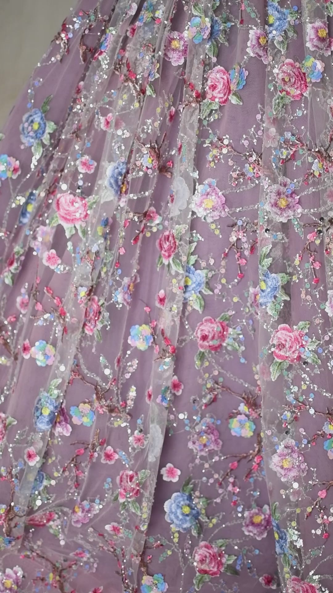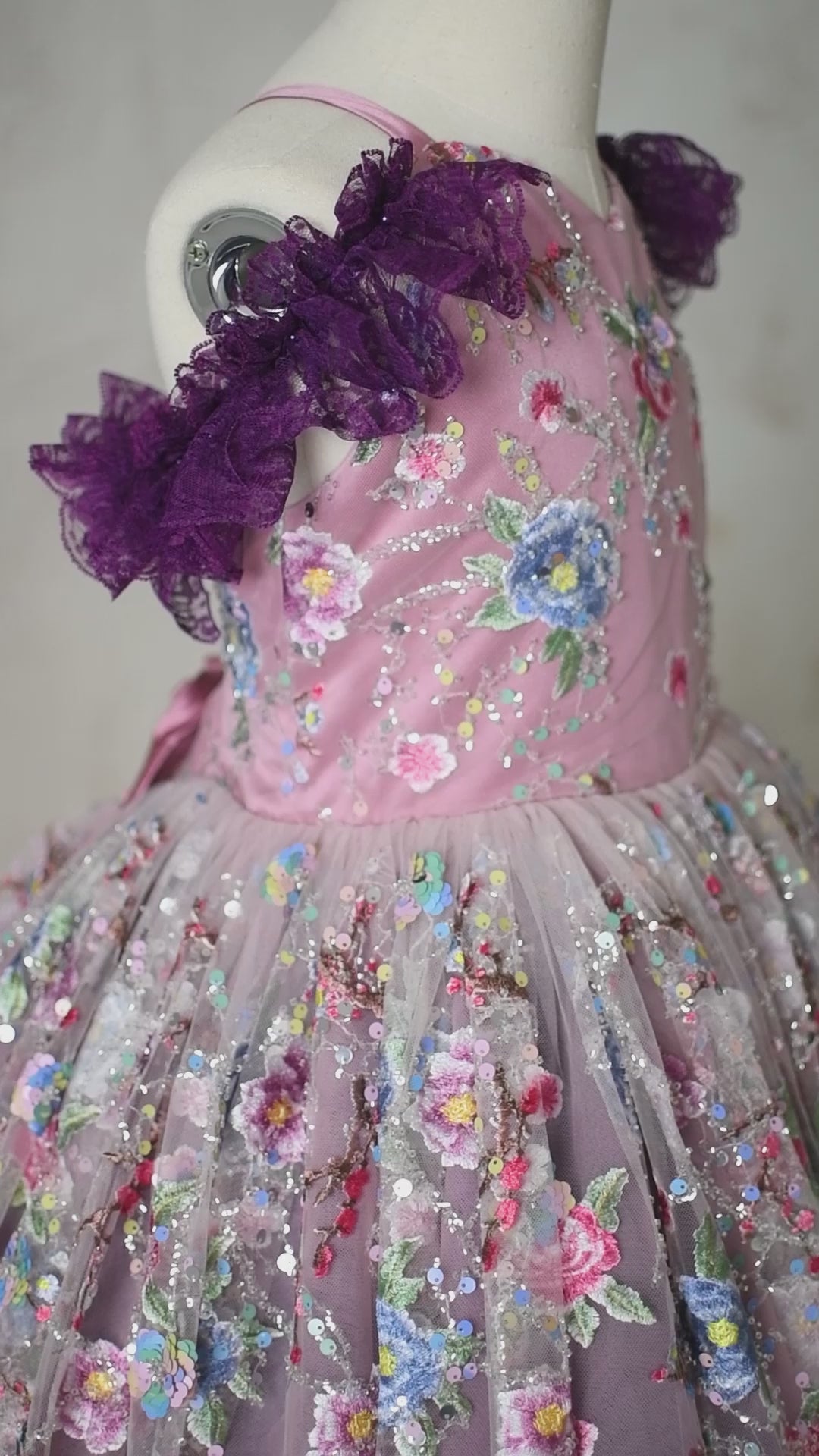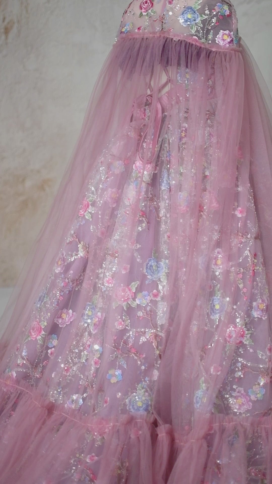 The Blush & Blossom Melody Gown is a breathtaking statement piece, designed for those who embrace elegance with a touch of whimsy. Crafted from exquisite sequin and beaded embroidered mesh tulle, this gown features delicate floral appliqués in soft pastel hues, shimmering with intricate details that catch the light beautifully. The off-shoulder design is adorned with purple lace ruffles, adding a unique contrast to the ethereal silhouette. A detachable tulle cape flows effortlessly, allowing for versatile styling—wear it for added drama or remove it for a classic, princess-like look. The adjustable back ensures a comfortable fit, while the skirt creates a regal presence with every movement.