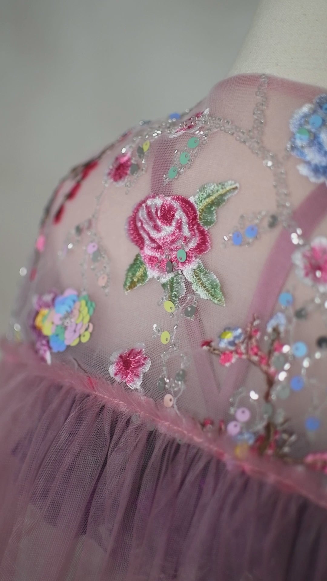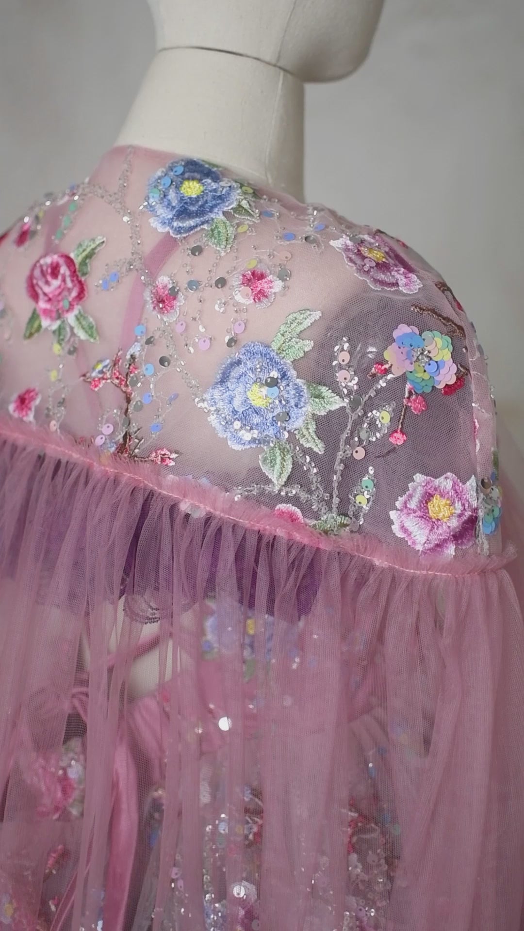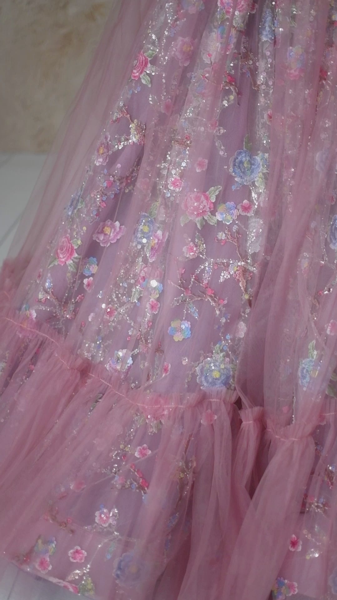 The Blush & Blossom Melody Gown is a breathtaking statement piece, designed for those who embrace elegance with a touch of whimsy. Crafted from exquisite sequin and beaded embroidered mesh tulle, this gown features delicate floral appliqués in soft pastel hues, shimmering with intricate details that catch the light beautifully. The off-shoulder design is adorned with purple lace ruffles, adding a unique contrast to the ethereal silhouette. A detachable tulle cape flows effortlessly, allowing for versatile styling—wear it for added drama or remove it for a classic, princess-like look. The adjustable back ensures a comfortable fit, while the skirt creates a regal presence with every movement.
