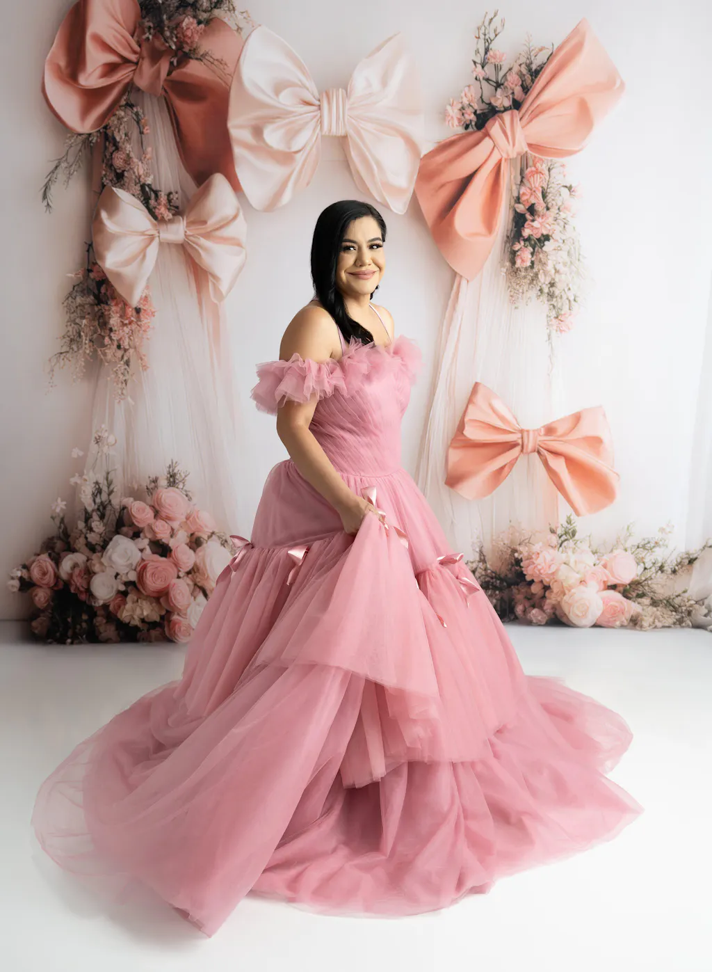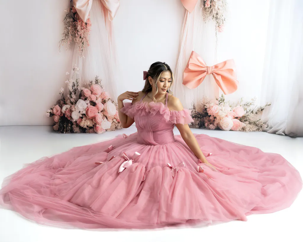 A vision of elegance and charm, the "Bows of Grace" gown is designed for those who love timeless beauty with a touch of whimsy. Crafted from layers of soft bridal tulle, this exquisite floor-length gown features delicate satin bows adorning the full skirt, adding a graceful and feminine touch.