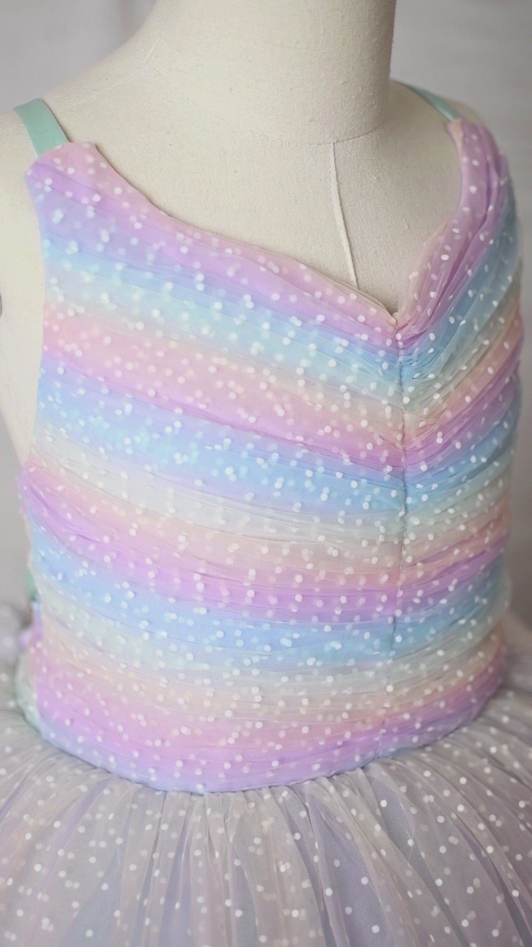Step into a world of rainbow and whimsical elegance with the Colorful Bliss Gown. This stunning floor-length dress features a playful rainbow swiss dot fabric that brings a fresh, joyful energy to any event. Designed with flower girls, photography sessions, and special occasions in mind, this gown combines delicate details and a bold splash of color.
