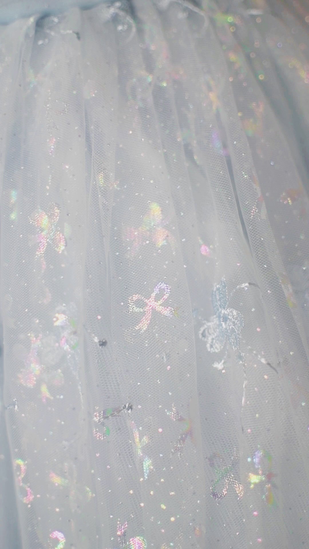 The turnaround time is 10-12 weeks, plus shipping time. The gown features a flexible back with shoulder ties for size adjustment, and the skirting is fully lined for a comfortable feel against the skin.