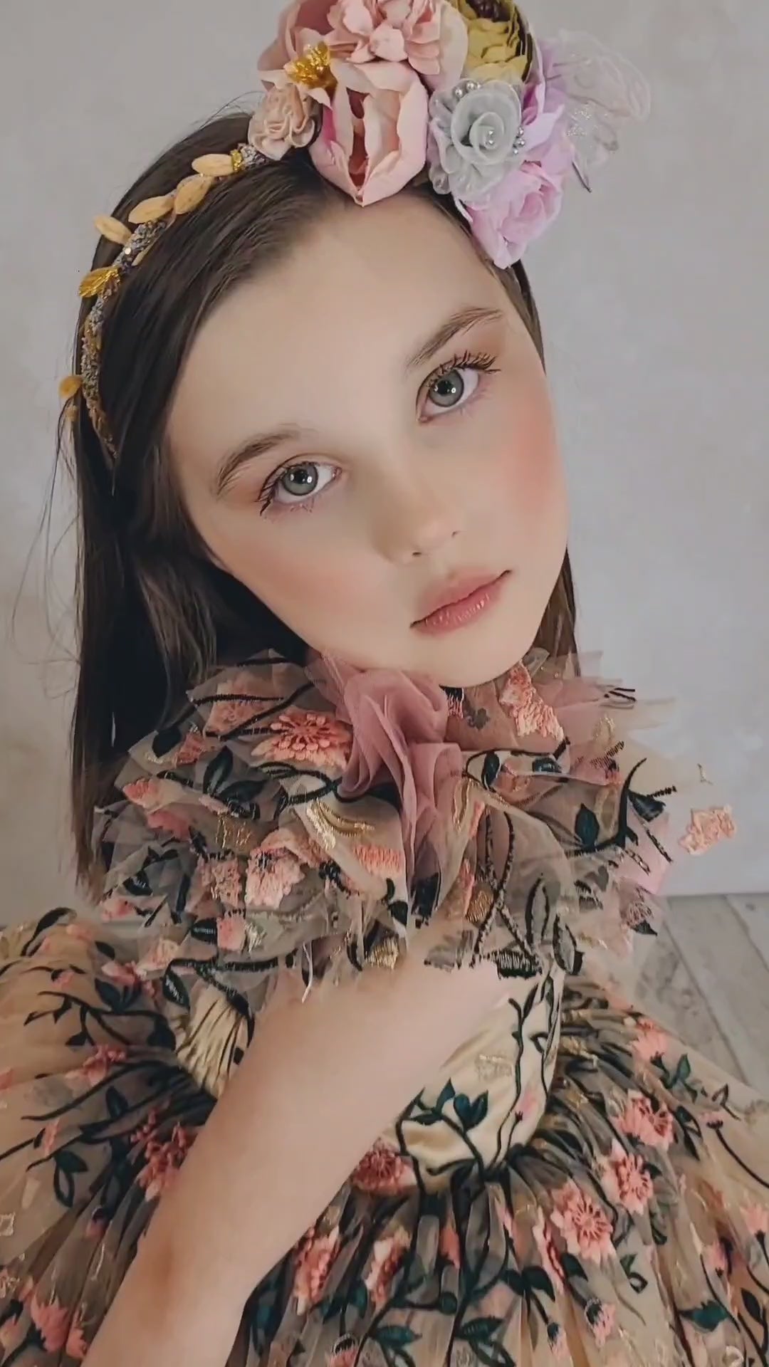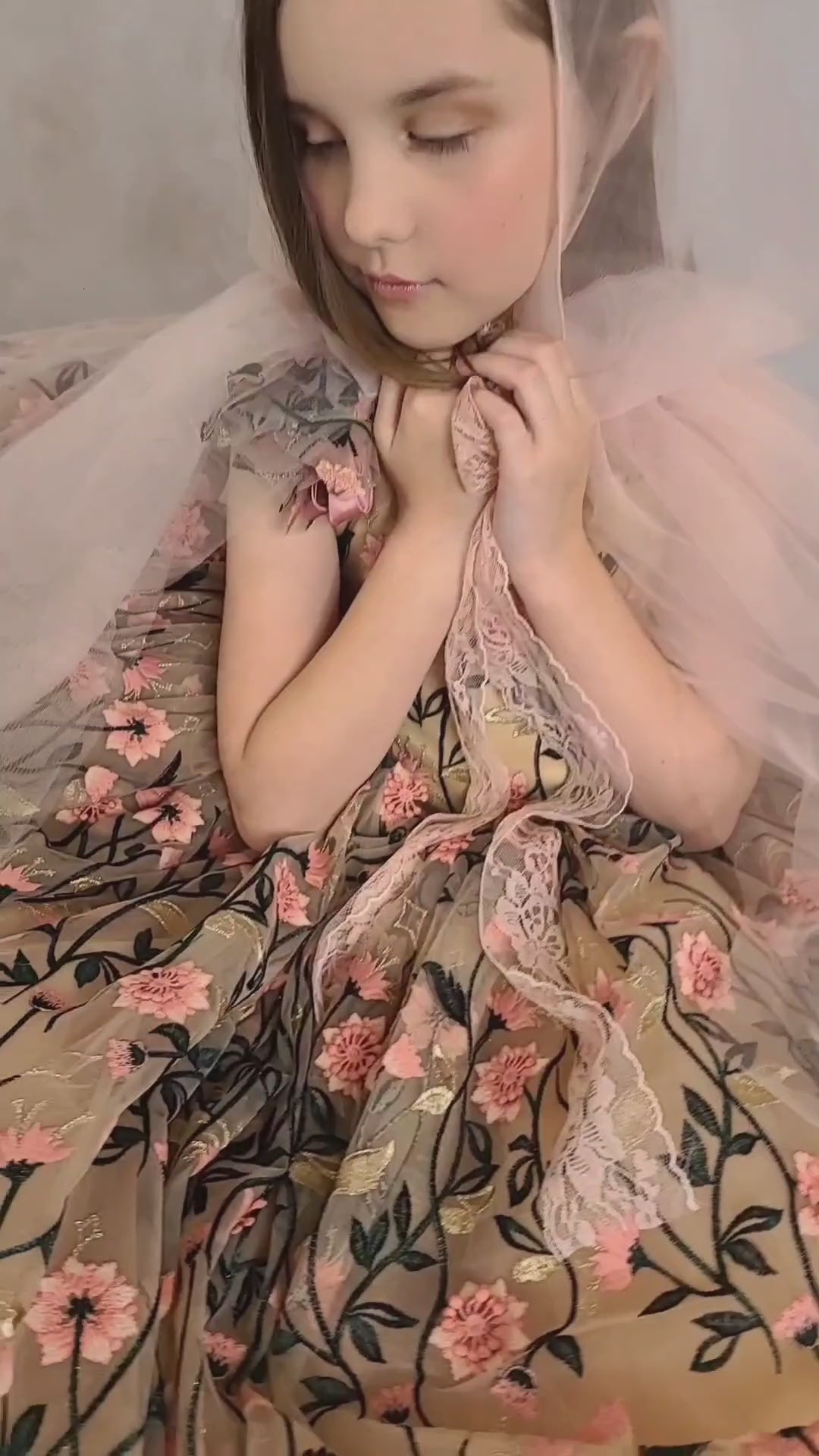 A perfect celebration of springtime, our "Dance of the blooms" is a floor length design crafted with a beautiful floral fabric, detailed with shades of pink and tan for a look that is timeless and elegant. Enjoy a photography session worthy of a fairy-tale with quality detailing that will have any little one twirling in bliss.