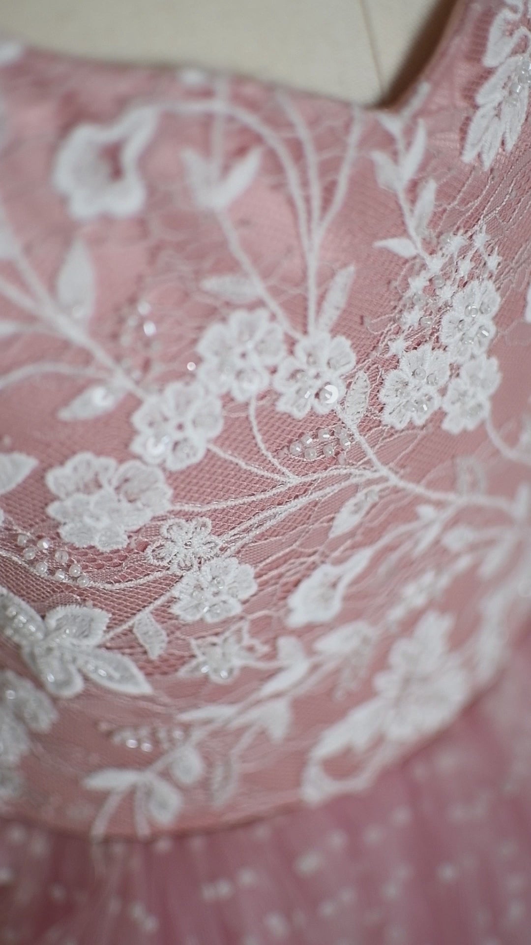 The skirt is a dreamy composition of layers, blending sequin fabric and swiss dot fabric in blush tones. This meticulous combination creates a gown that's not only visually captivating but also exquisitely comfortable. Elevate your photography experience with the enchanting Dentelle Rose, the perfect gown for capturing timeless moments.