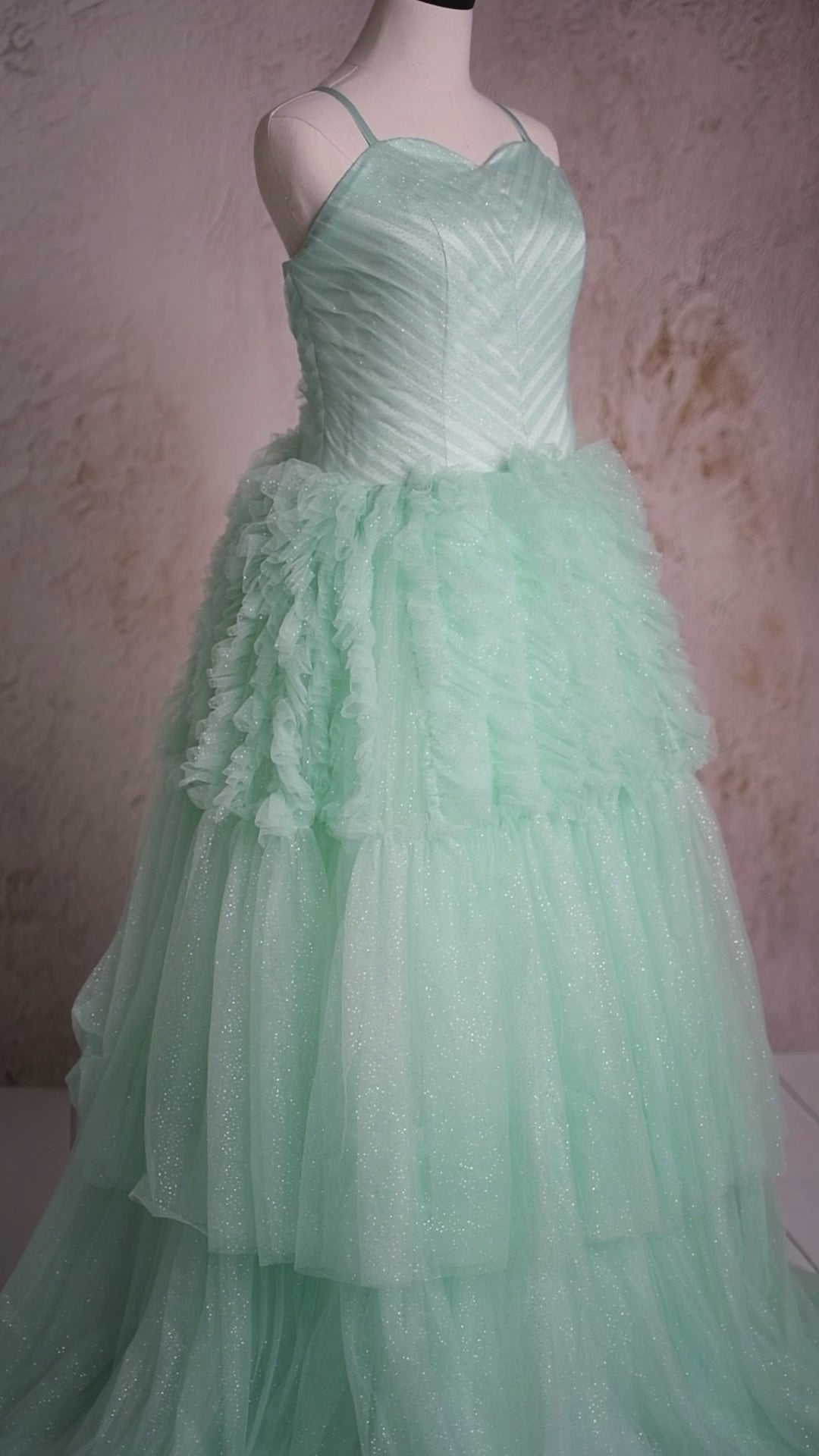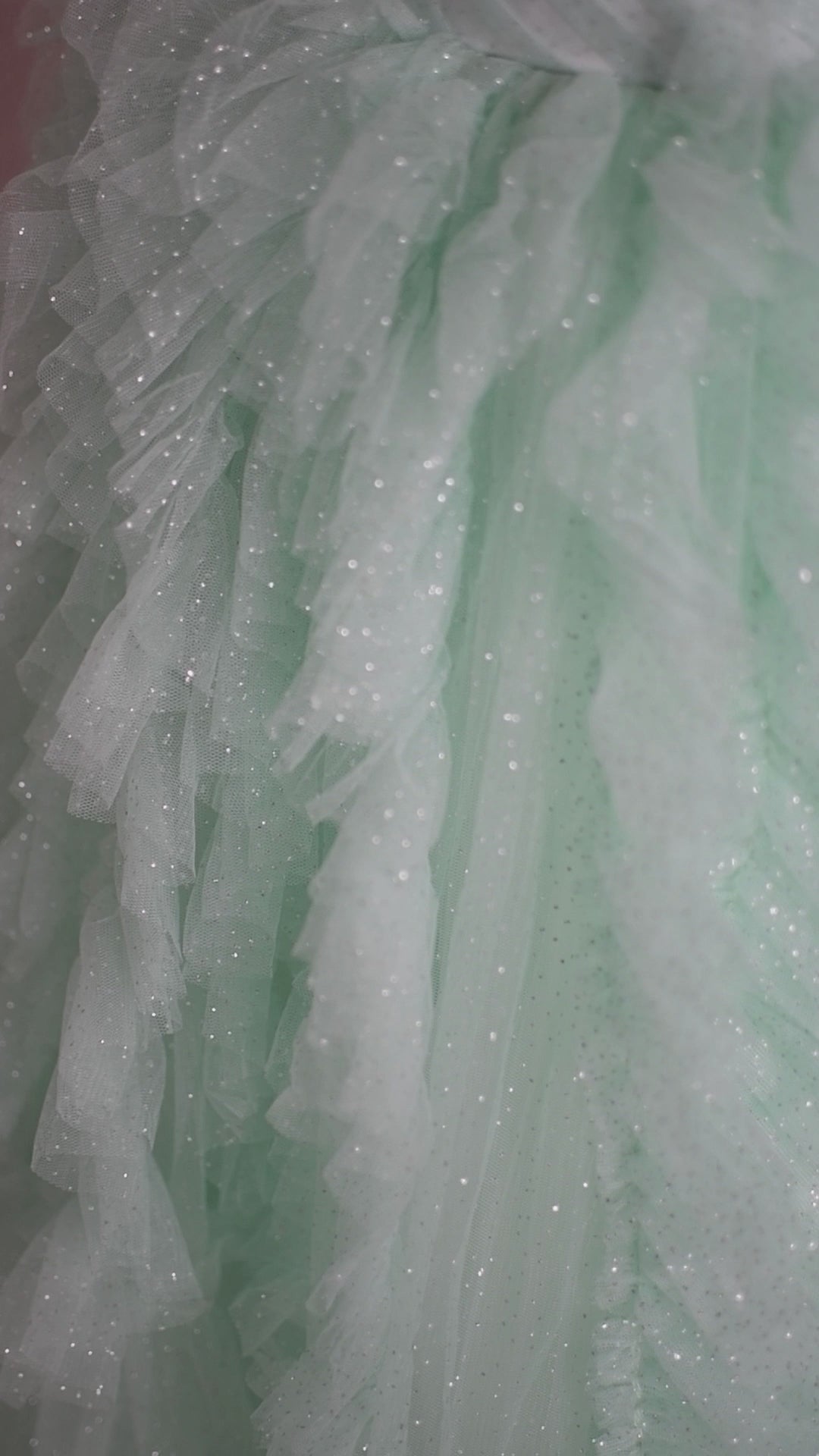 Immerse yourself in timeless elegance and charm with our Ethereal Whisper Dress. This exquisite floor-length adult gown is crafted from shimmering glitter fabric, beautifully blending classic allure with modern whimsy. The bodice is adorned with stunning glitter pleated fabric. This silhouette is thoughtfully designed for practicality, featuring adjustable shoulder ties that tie into a corseted back for a comfortable yet adjustable fit.