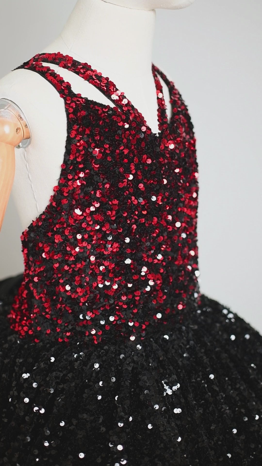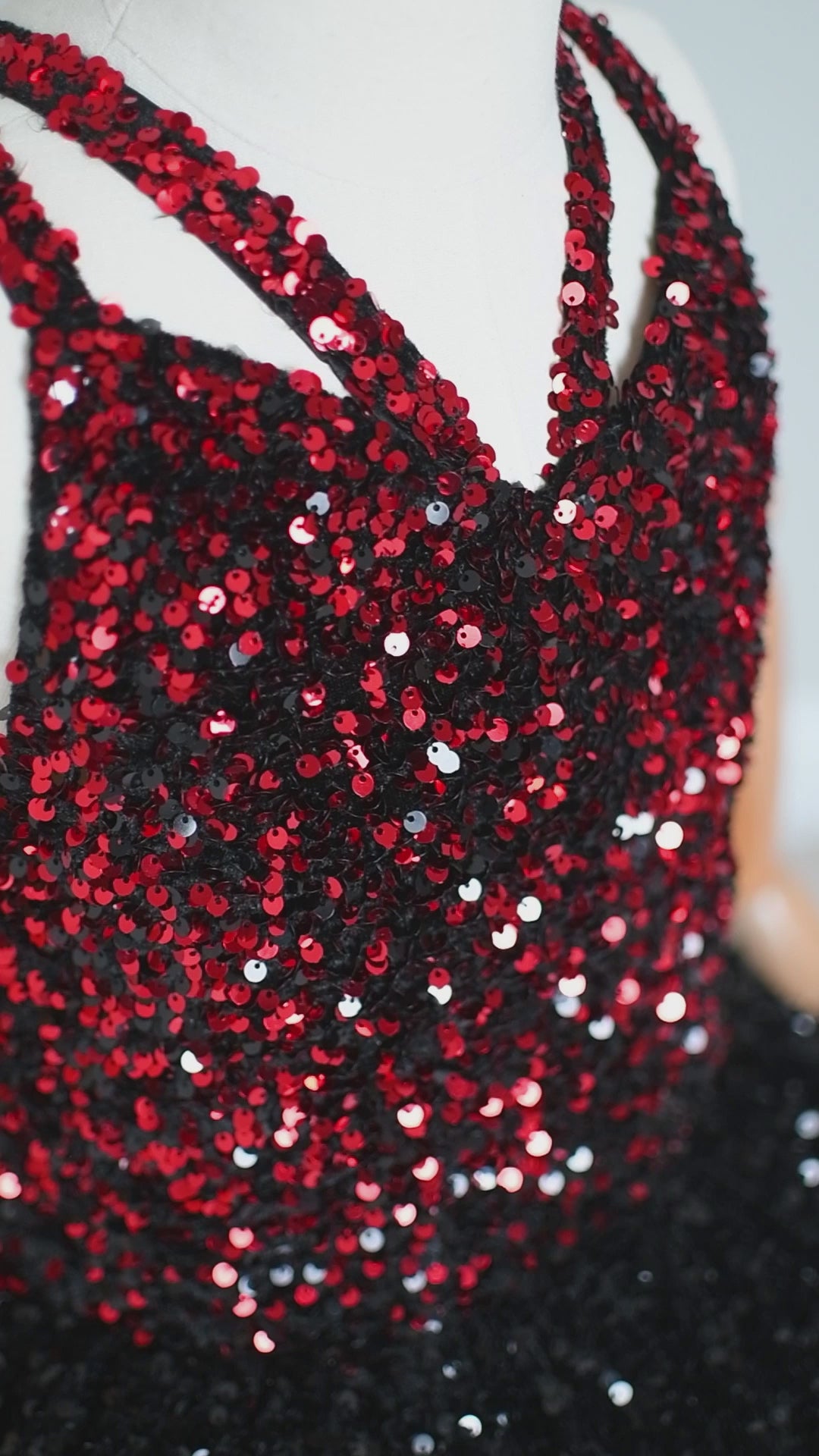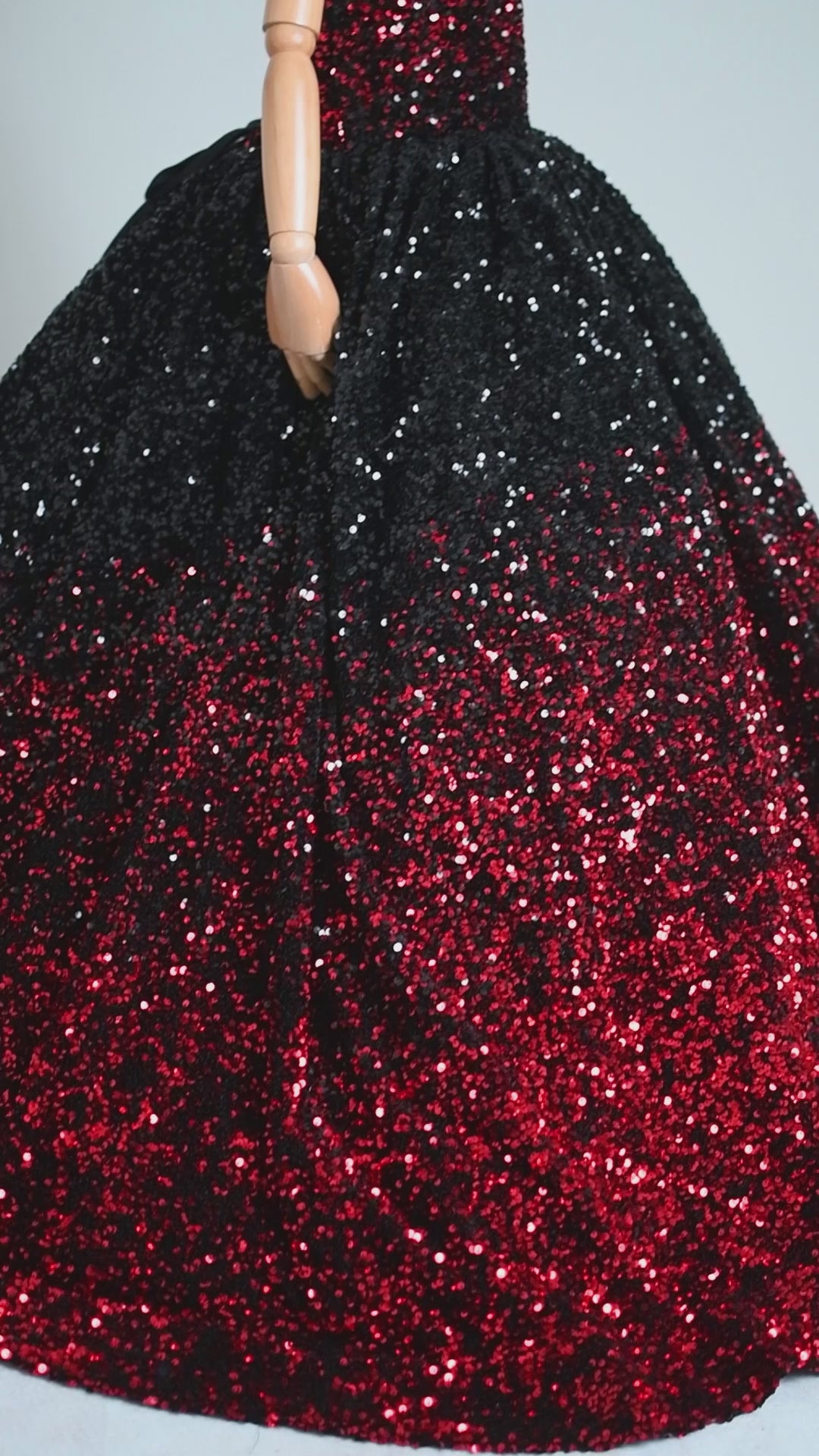 Crafted from luxurious ombre red and black sequin velvet fabric, this floor-length gown shimmers with elegance and allure. The intricate sequin detailing adds a touch of drama, echoing the edgy yet sophisticated vibe.