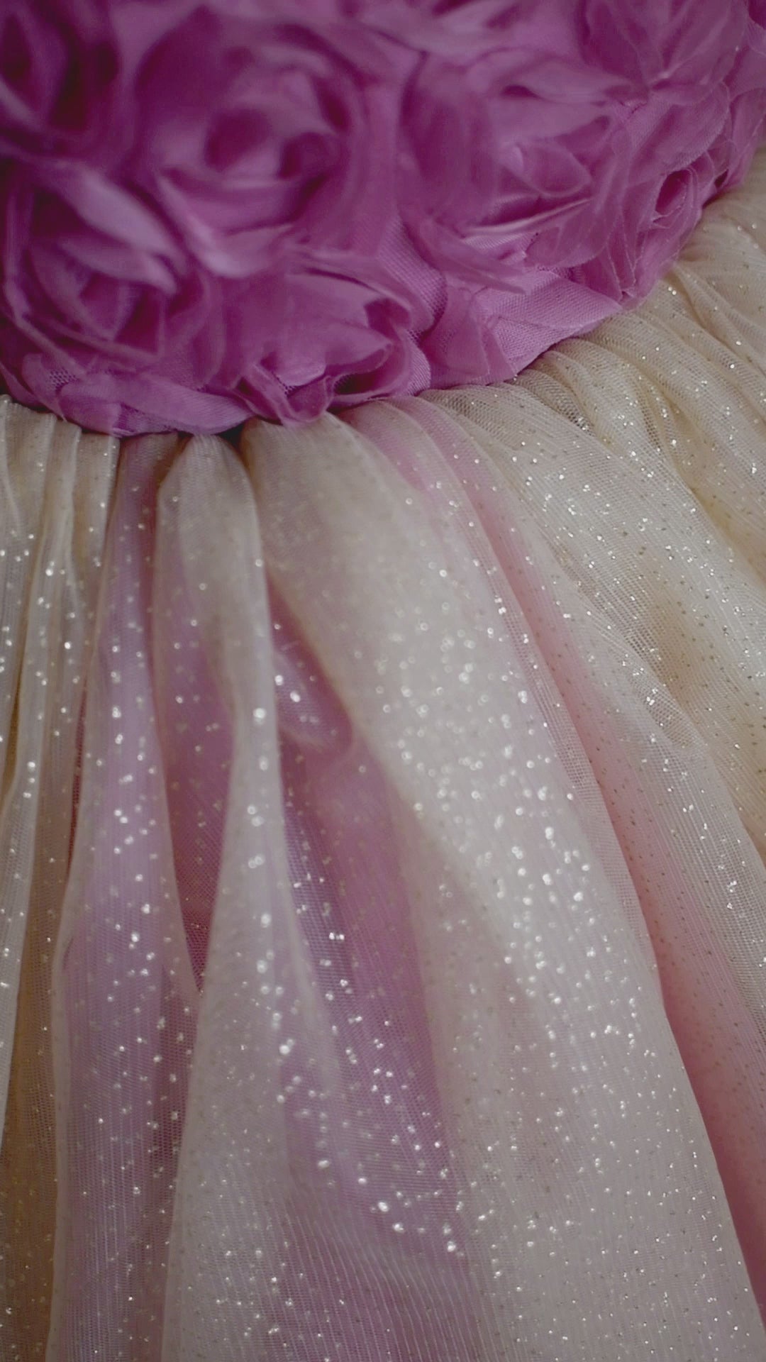The skirt boasts tiers of shimmering gold glitter overlay mesh and blushy mauve tulle underskirt, creating a dreamy, layered effect that adds graceful movement to every step. Fully lined for comfort and durability.