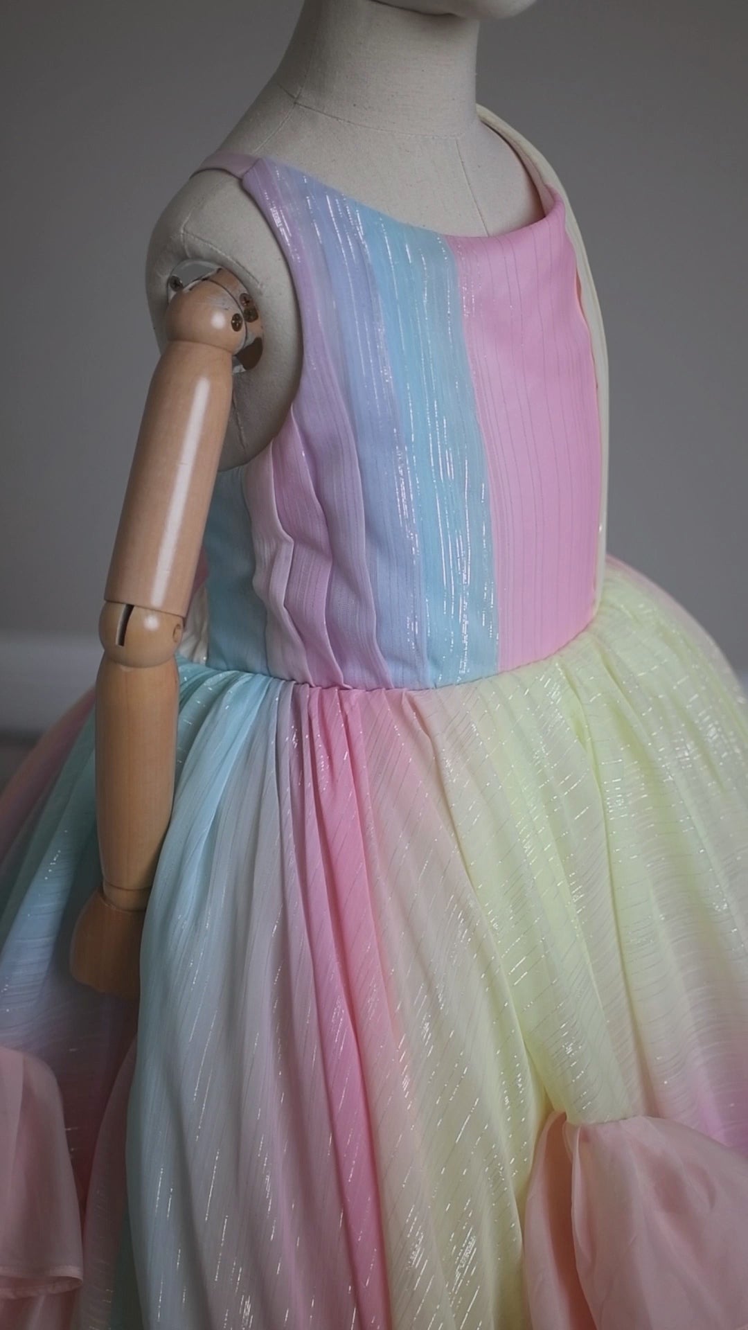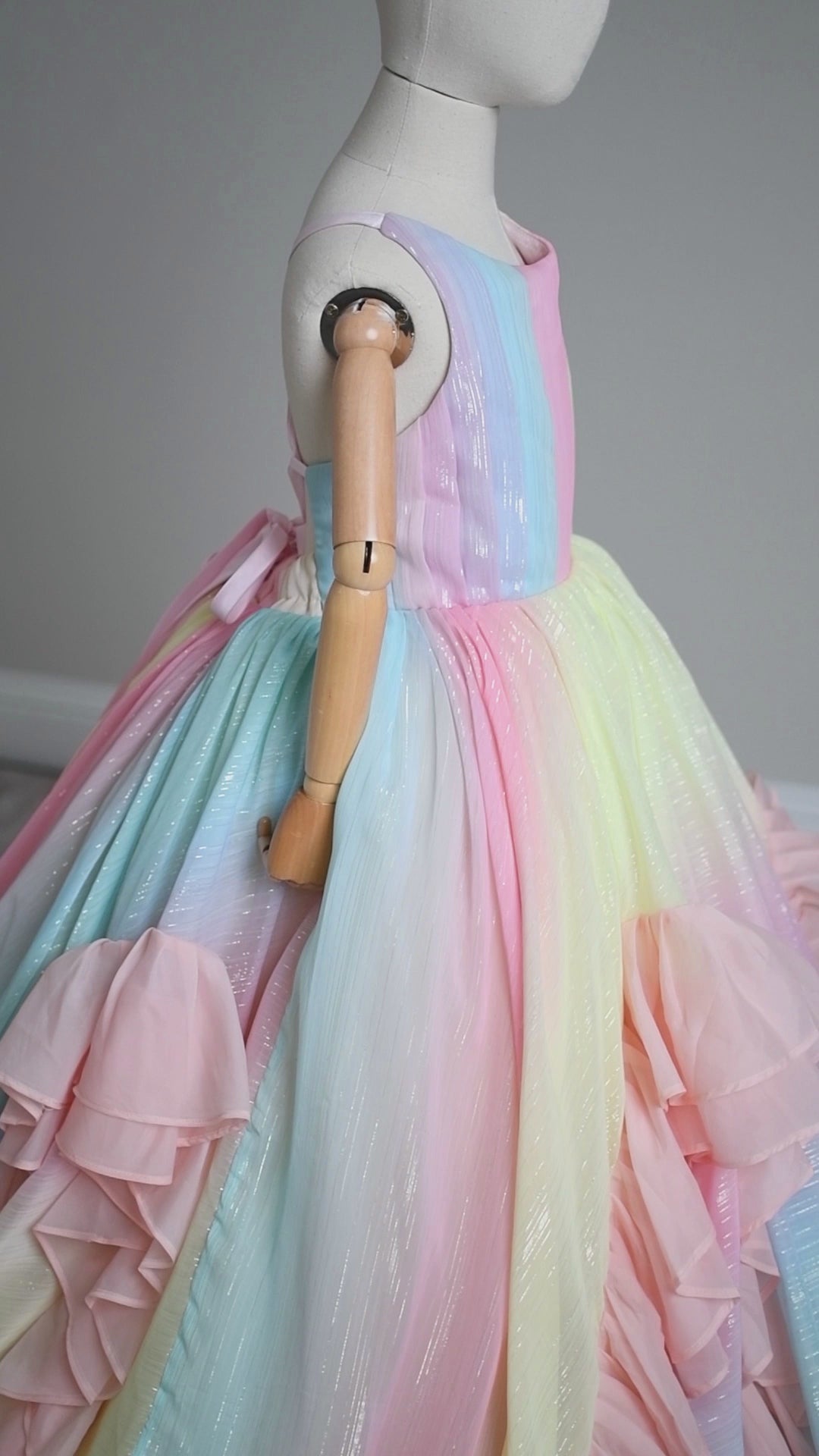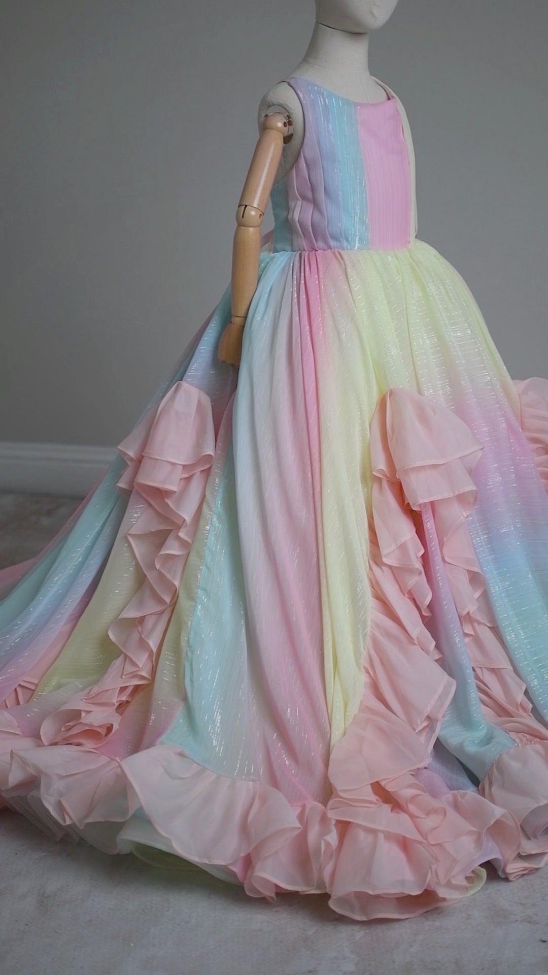 Introducing our exquisite Couture Rental Gown, the "Petal Whispers" Pastel, a floor-length dress designed for ages 6 to petite 8 years. Crafted with meticulous care, this gown is made of hundreds of yards of luxurious chiffon, ensuring a dreamy and flowing silhouette.