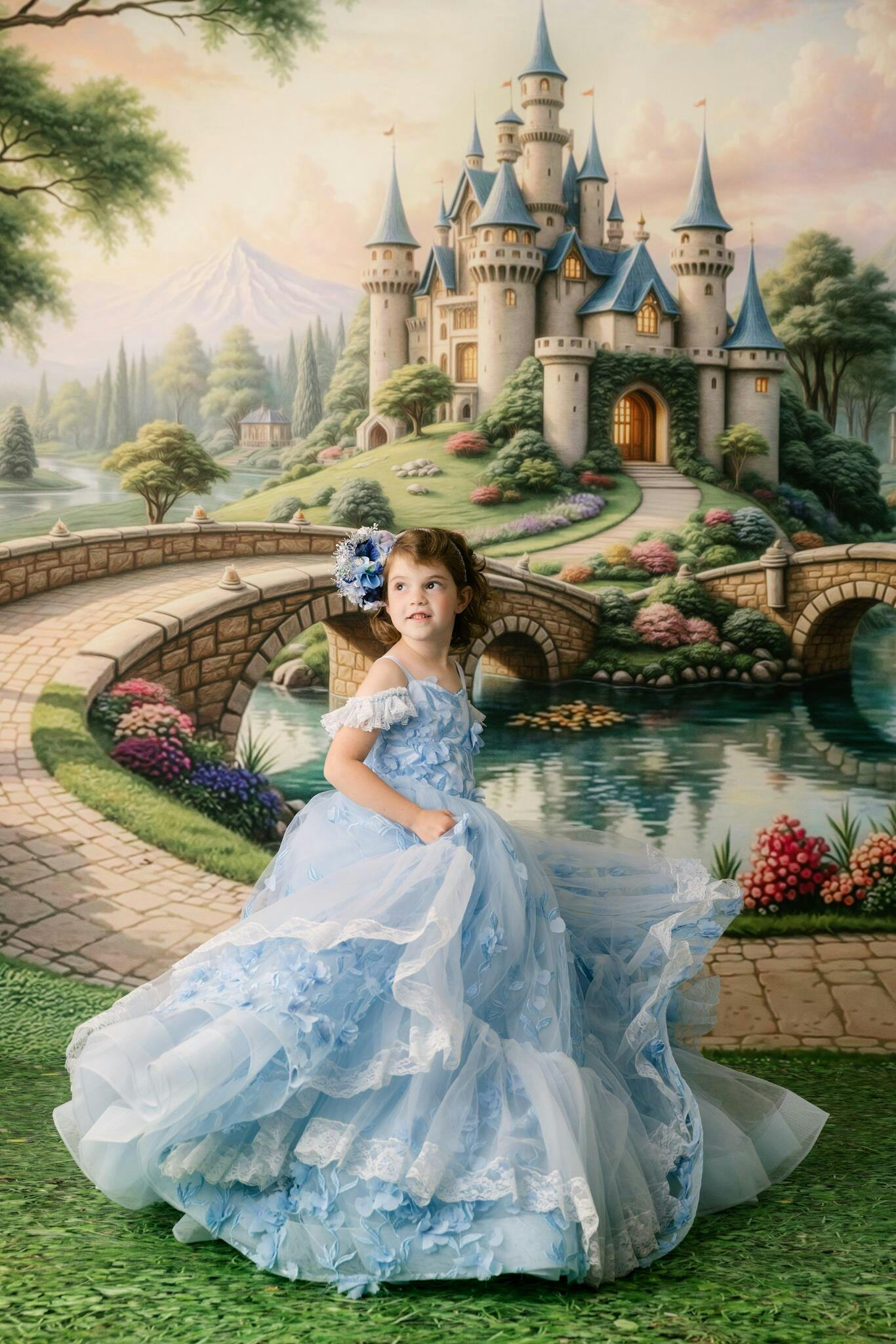 The Madeleine gown is a beautiful, floor-length dress in lovely shades of blue. It's made with unique blue 3D fabric that really stands out. The skirt of the dress features stylish pickups, giving it a full and elegant look. Adding to its charm are the delicate off-shoulder lace details on the bodice.