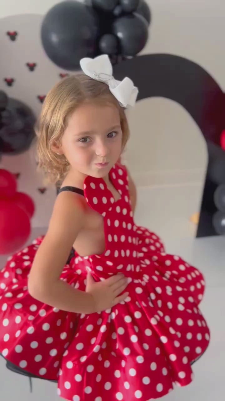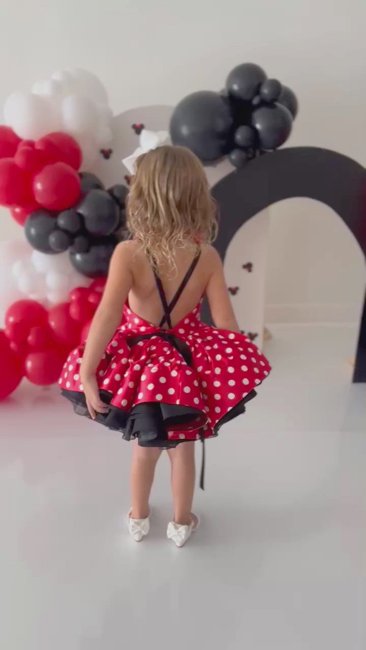 Capture the magic of your little one's Minnie-themed birthday with the charming "Miss Mouse" Polka Dot Dress! This delightful petal-length gown, perfect for toddler girls aged 3-4 years up to a small 5-6 year, features classic polka dots. The adjustable shoulder tie and elastic waist at the back ensure a comfortable, custom fit for your little fashionista.