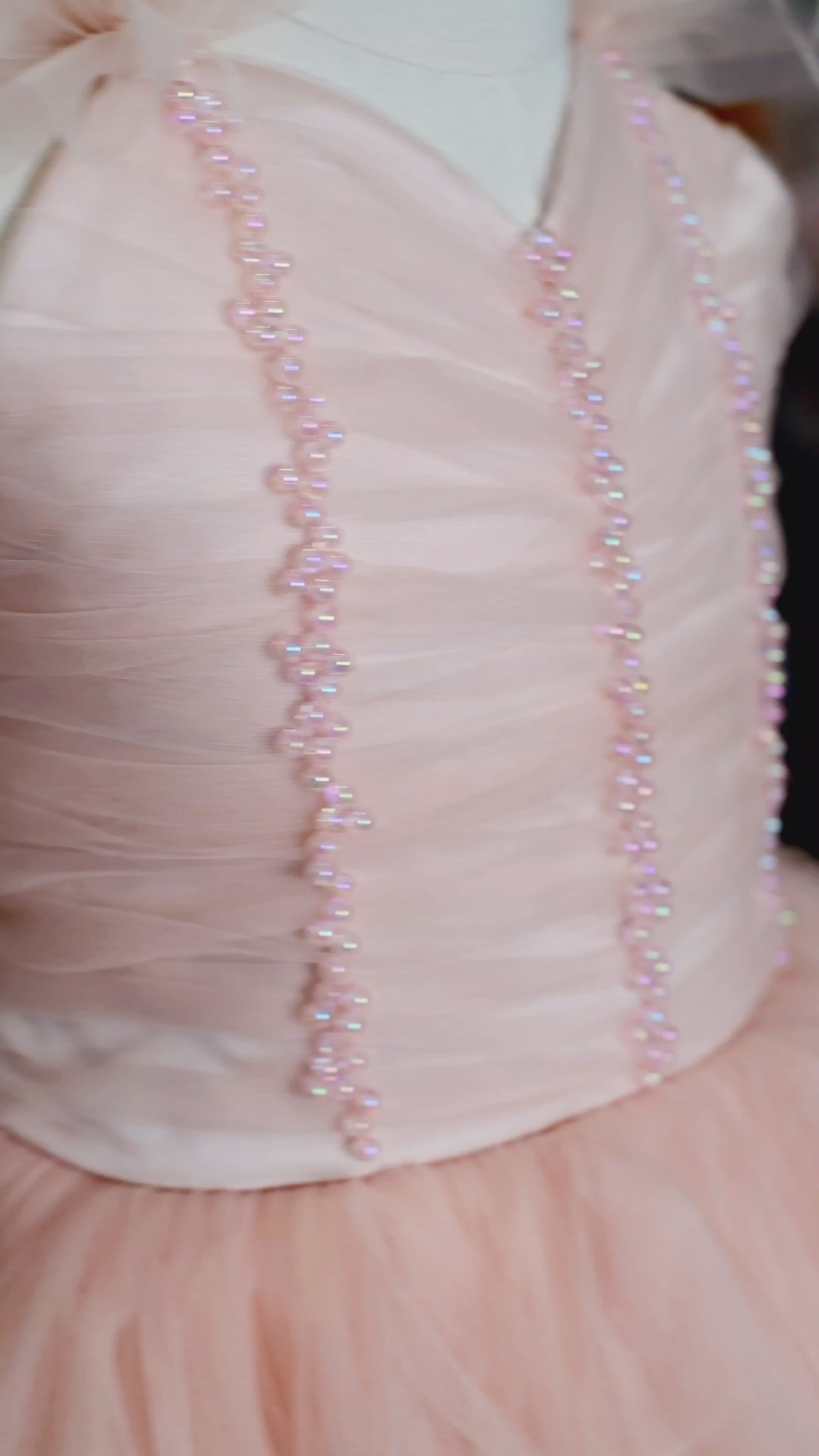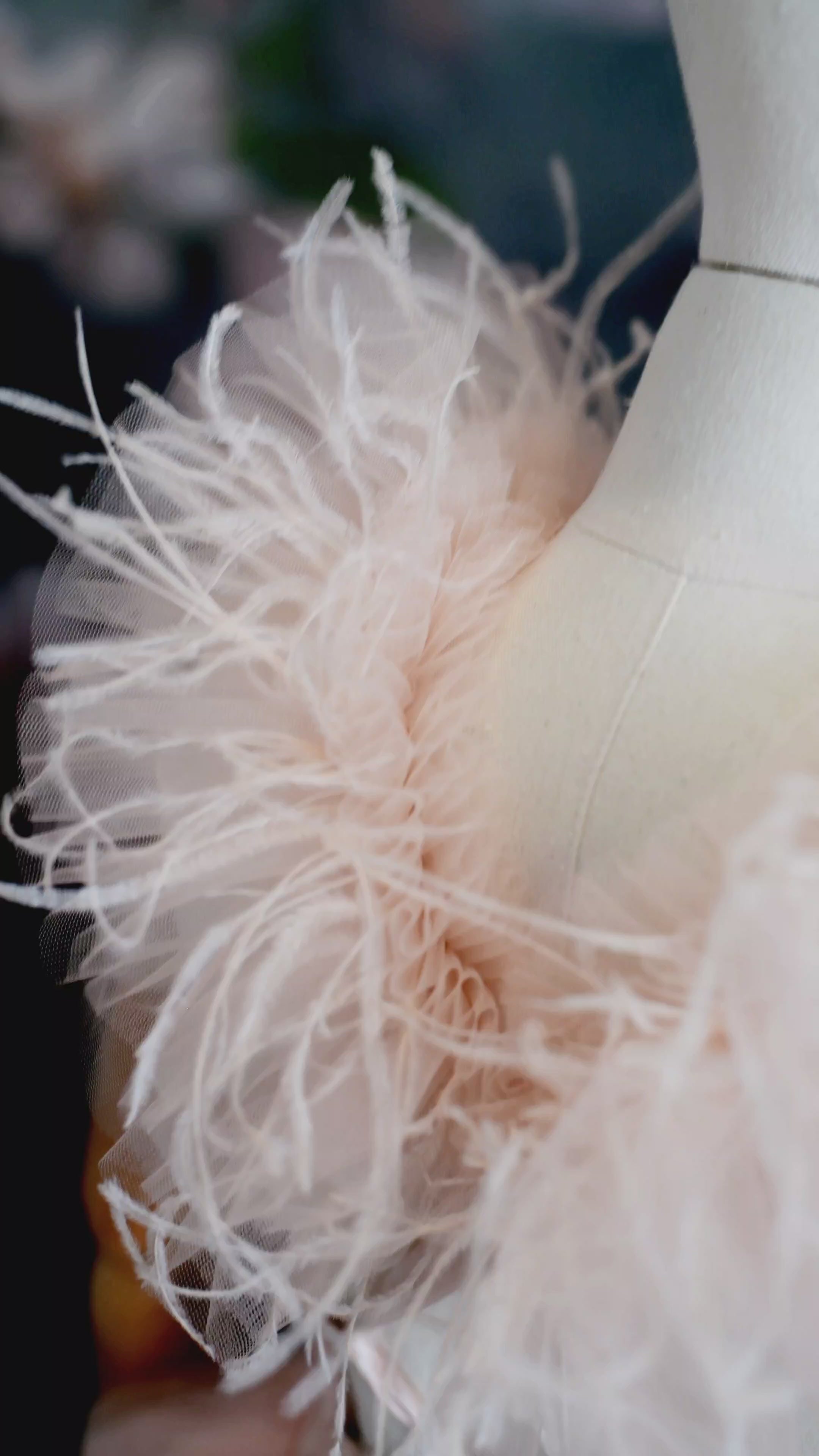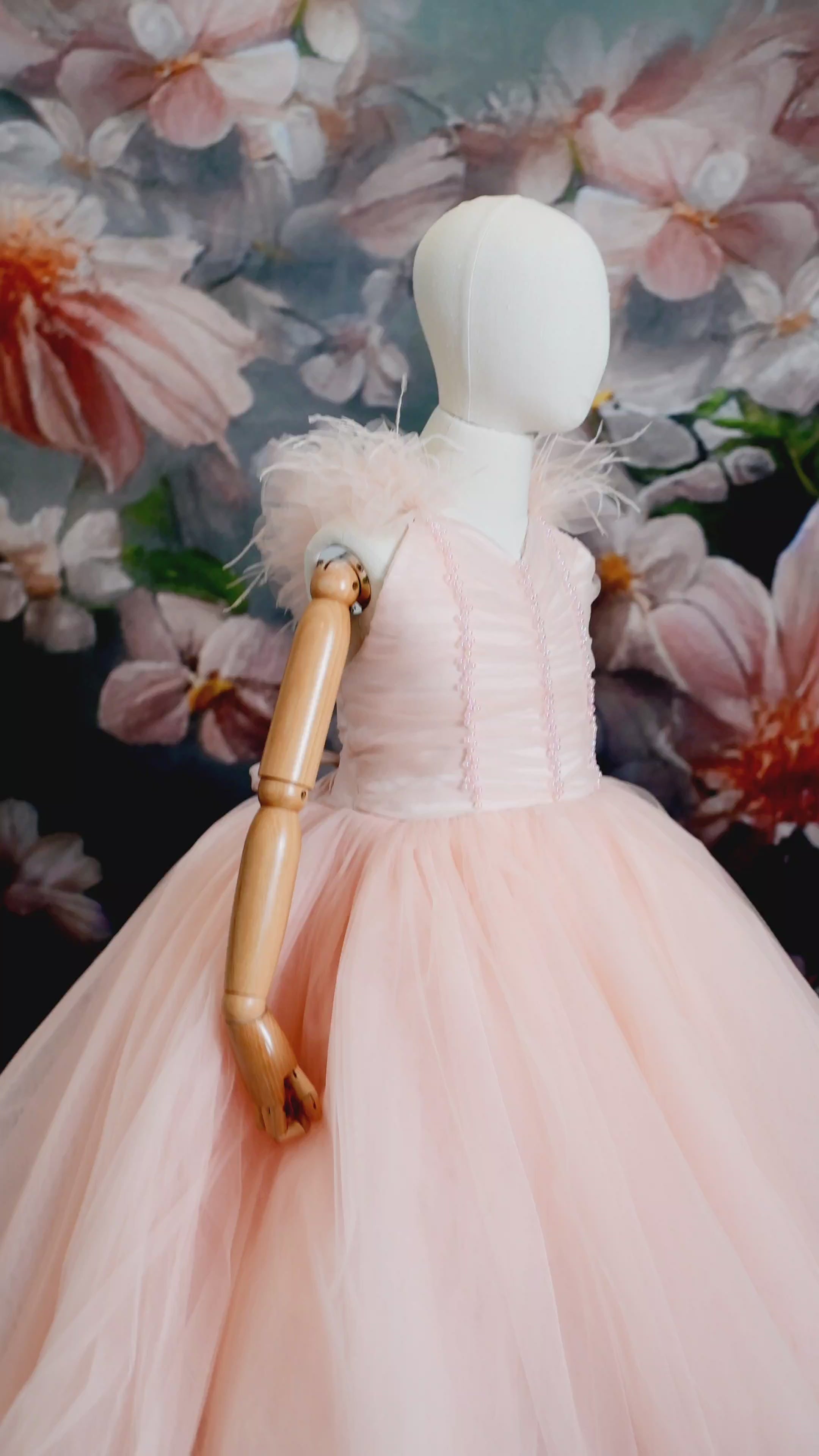 Step into a fairytale wearing our "Monreau" gown! This ethereal floor length dress is perfect for any photography session, with an adjustable fit that's designed to fit a few ages. It's crafted with beautiful peachy pink bridal soft tulle, feather details, and iridescent beads for a sweet and feminine look. Its ruffled skirt truly adds that wow factor!