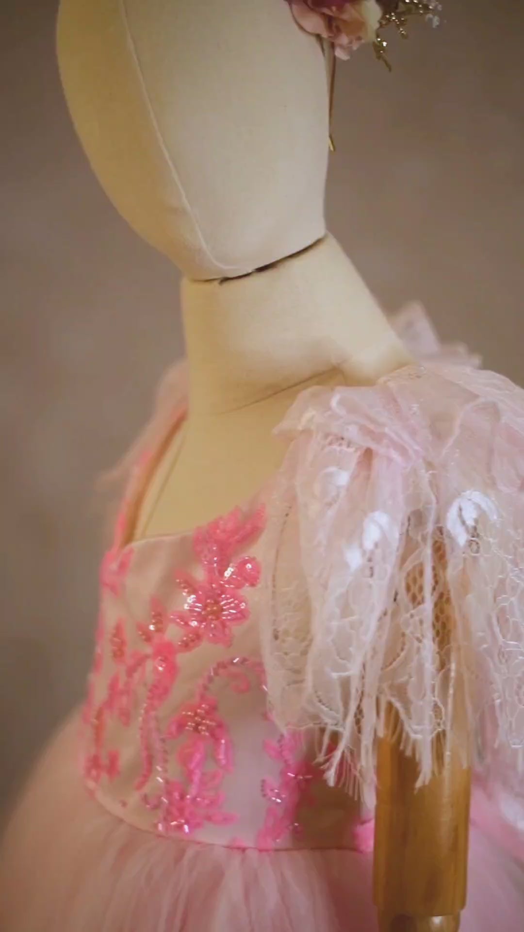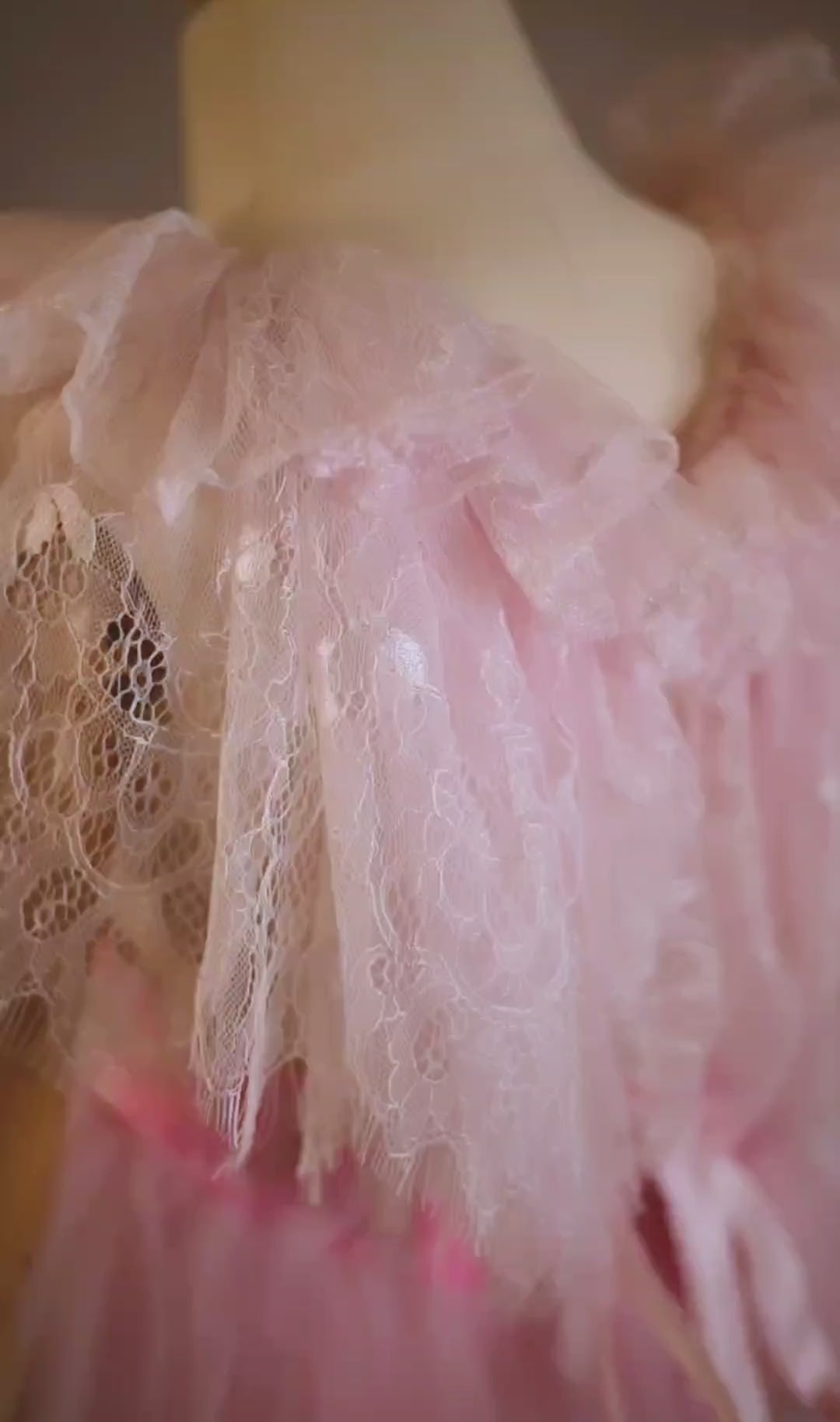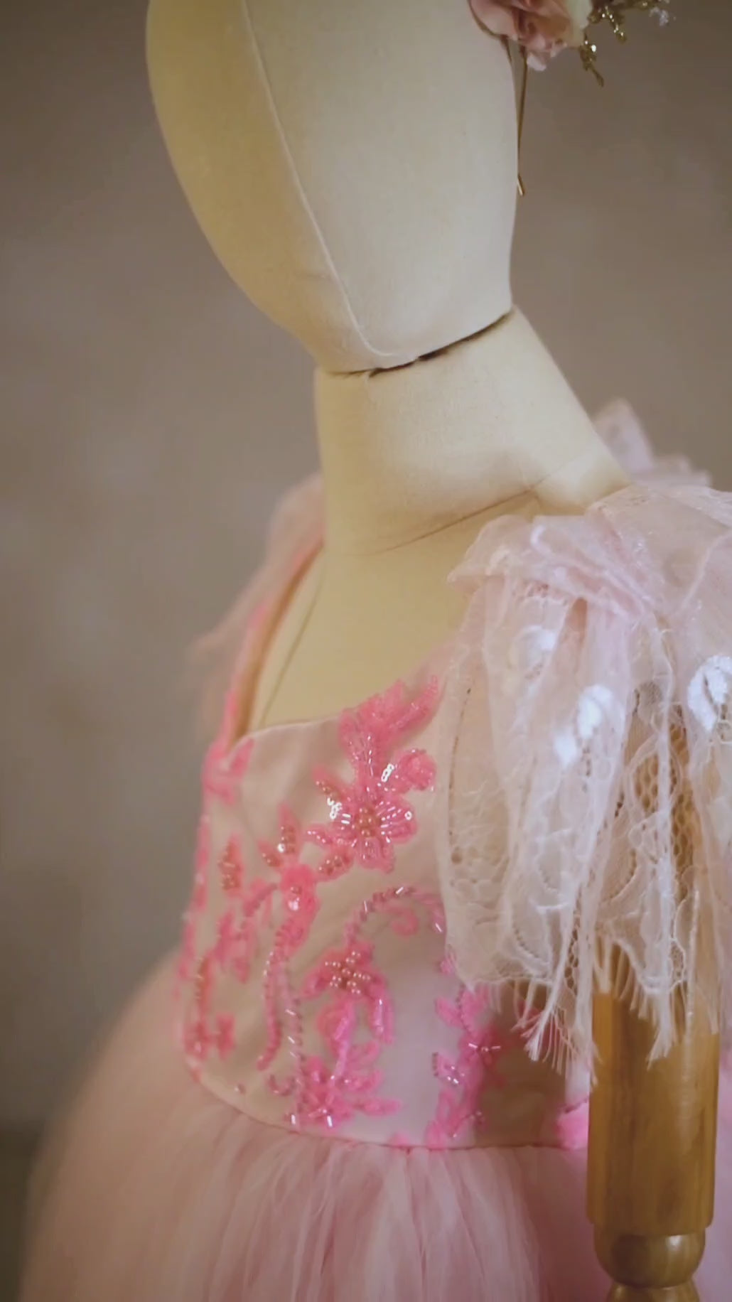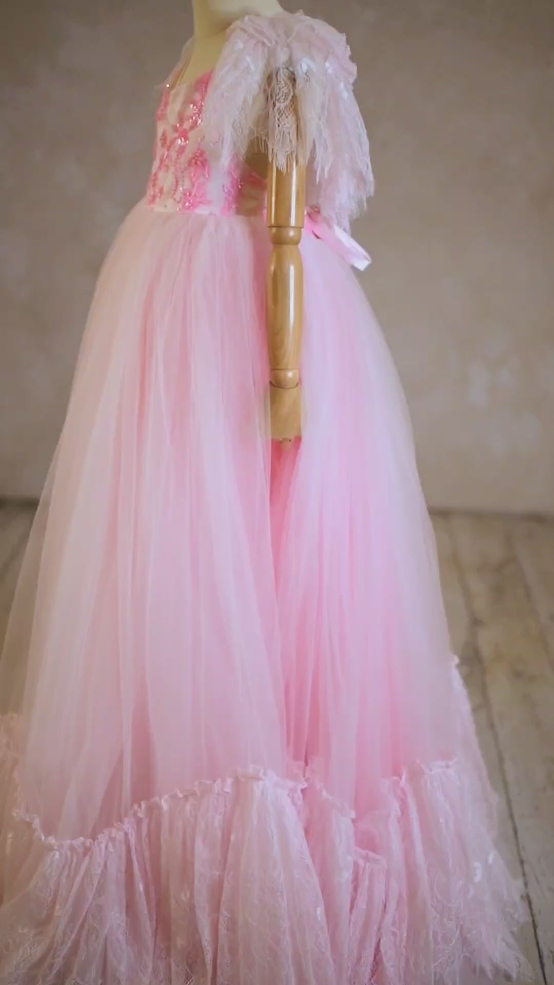 Our "Pink Dazzle" gown is made with beautiful bridal soft tulle in shades of soft and bold pink. Her bodice features a beautiful bright pink beaded fabric which adds to her charm. Lace details on the adjustable shoulder ties and skirt trim - truly make this gown a showstopper.