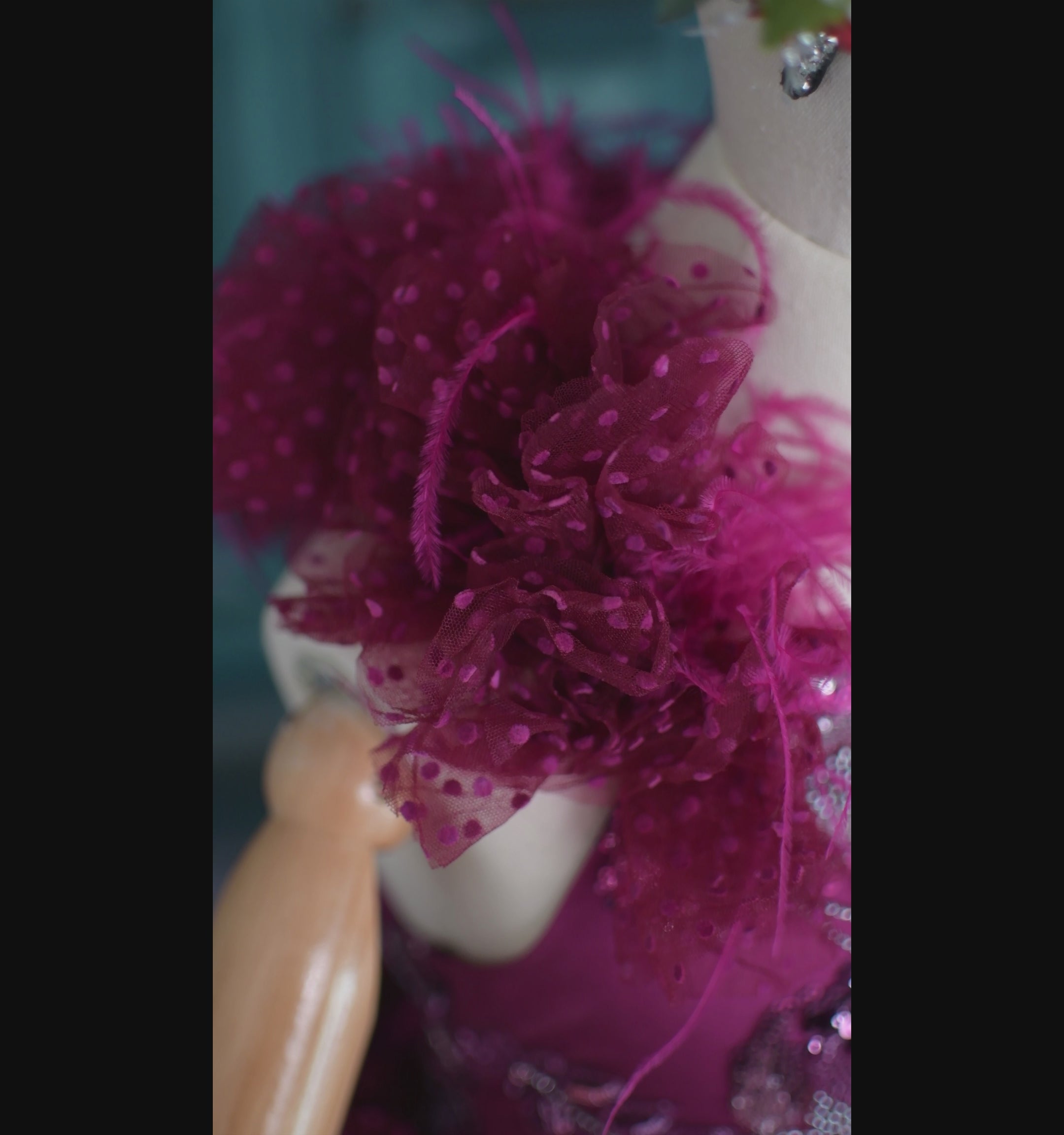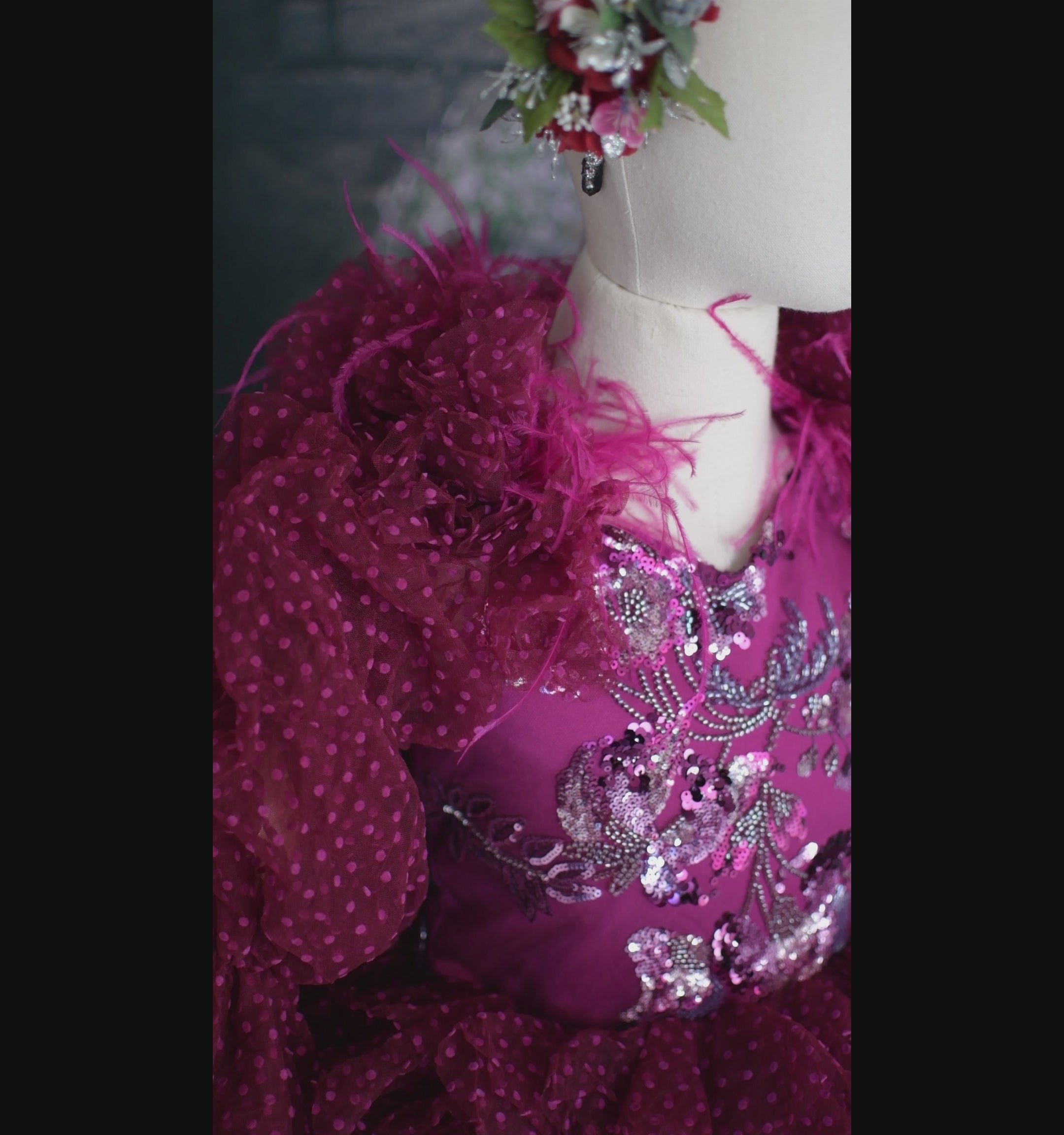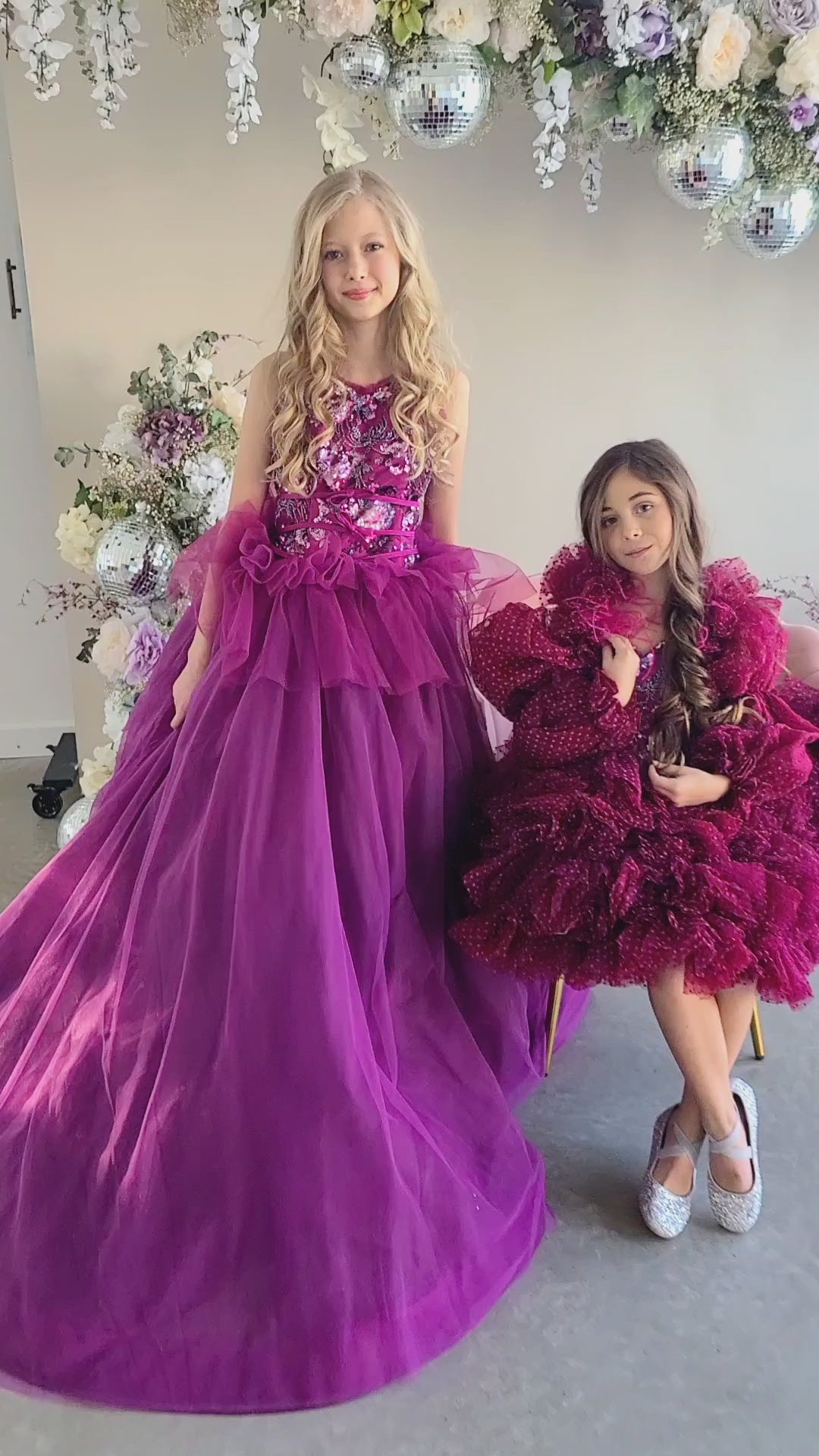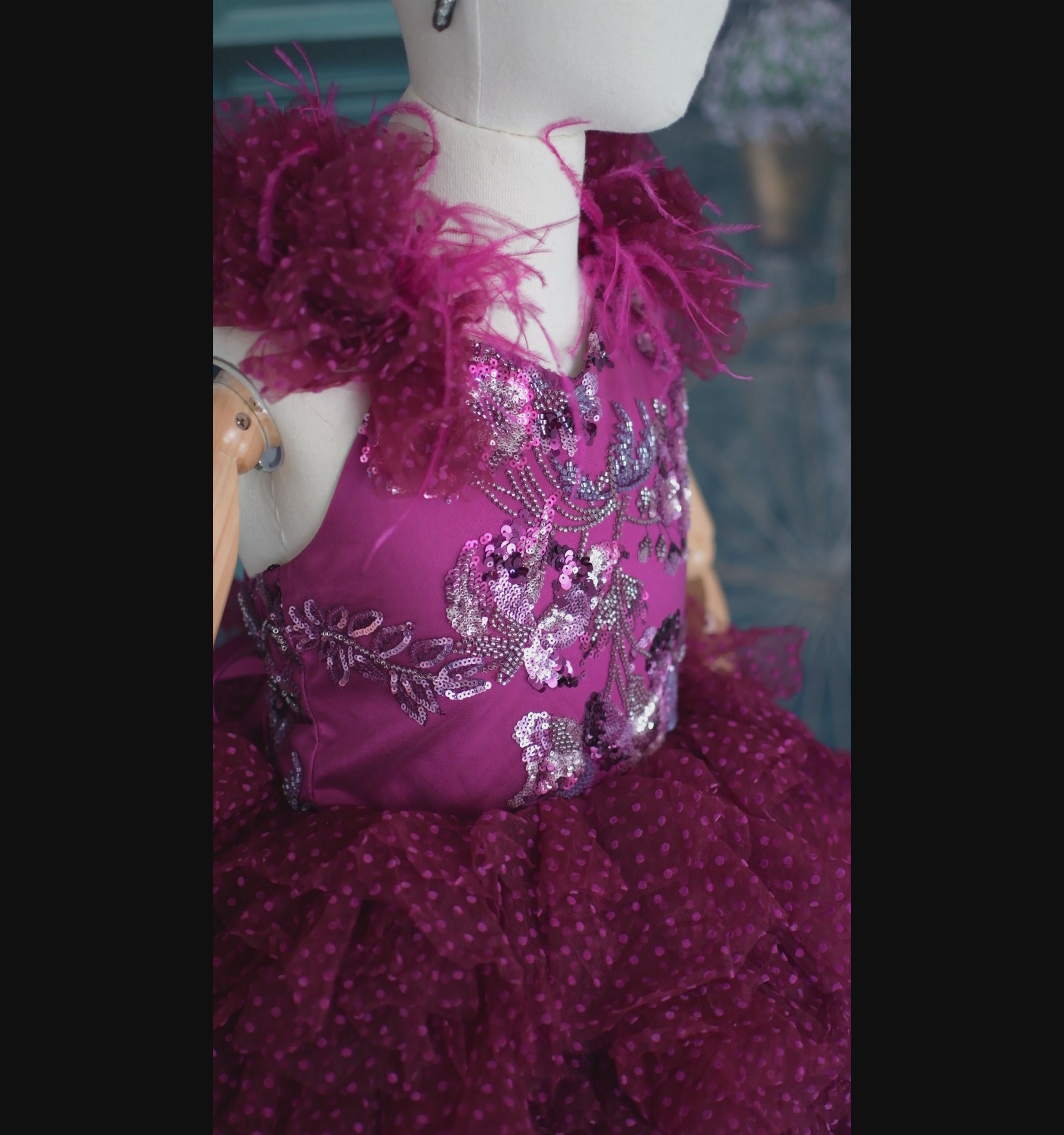 Introducing our "Radiant Orchid" dress - the epitome of elegance and whimsy, perfect for photographers and moms seeking a unique, eye-catching gown for special photo shoots. This dress stuns with its vibrant fuchsia color, a rich blend of purple and pink, complemented by the playful texture of Swiss dot fabric on its layered skirt. Each layer is artfully arranged to mimic delicate petals, adding a fairy-tale-like charm.