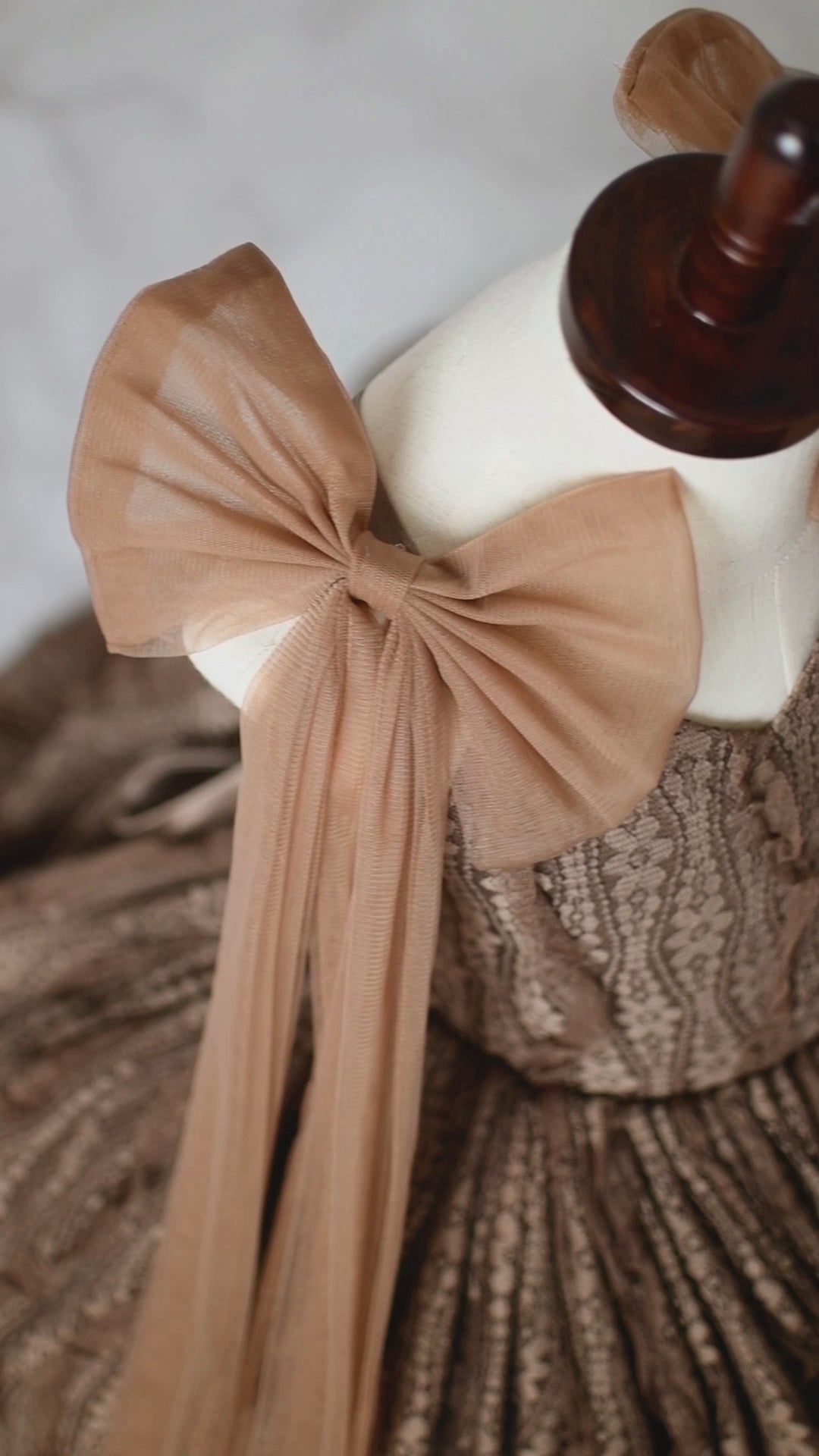 A unique touch? The gown is styled with oversized tulle shoulder ties that are completely removable, allowing for effortless versatility in your shoot or event look. Wear them for added whimsy and flair—or remove them for a more classic, clean silhouette.