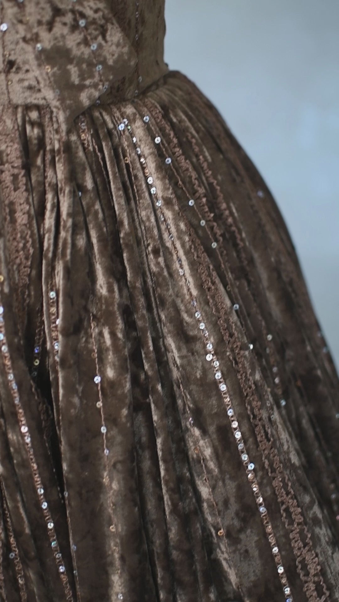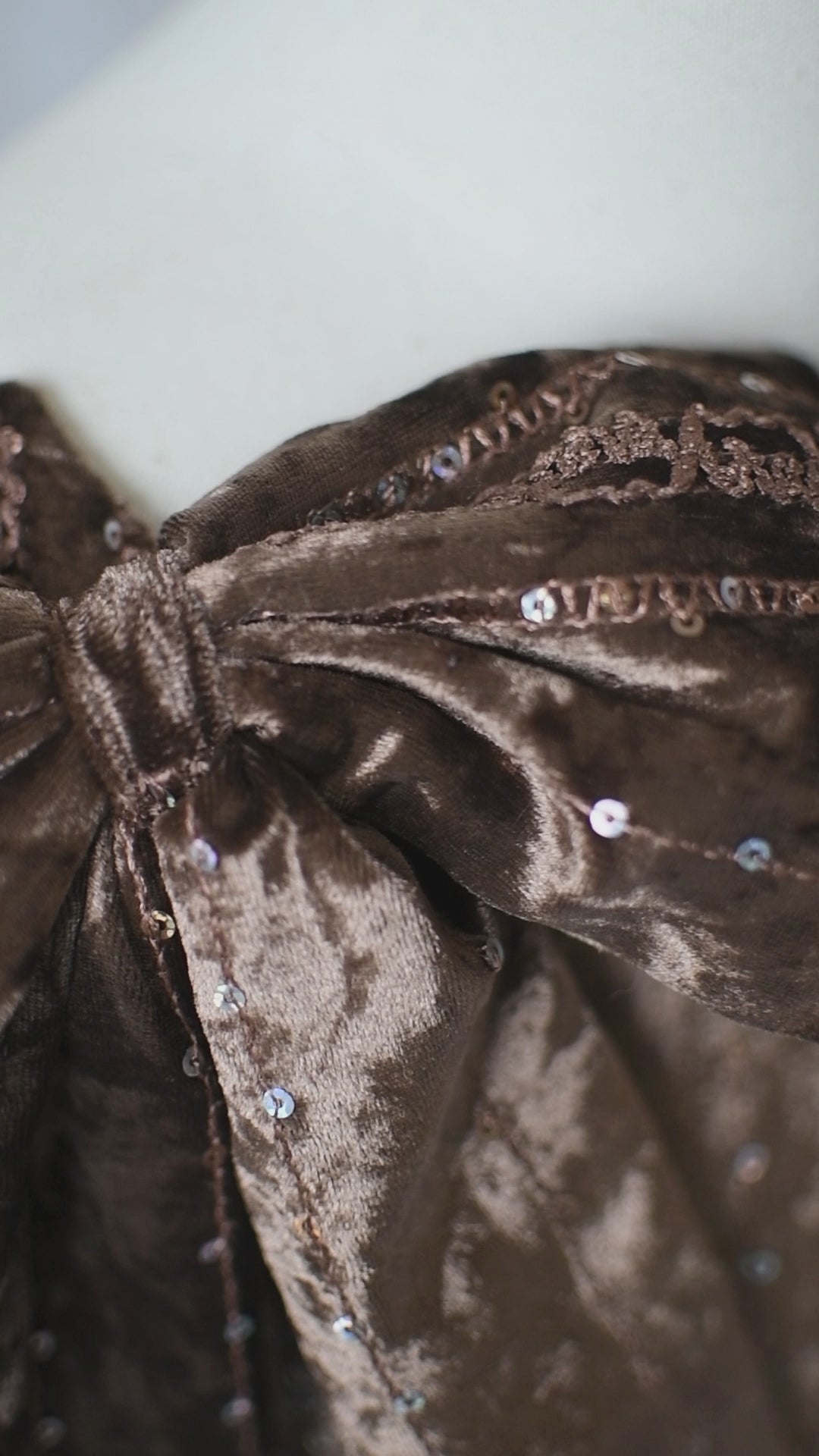 Elevate any special session with the luxurious Windsor gown, crafted from rich brown velvet that exudes timeless elegance and warmth. This floor-length gown features exquisite lace and sequin detailing, adding a delicate shimmer and vintage-inspired texture that makes every moment unforgettable.
