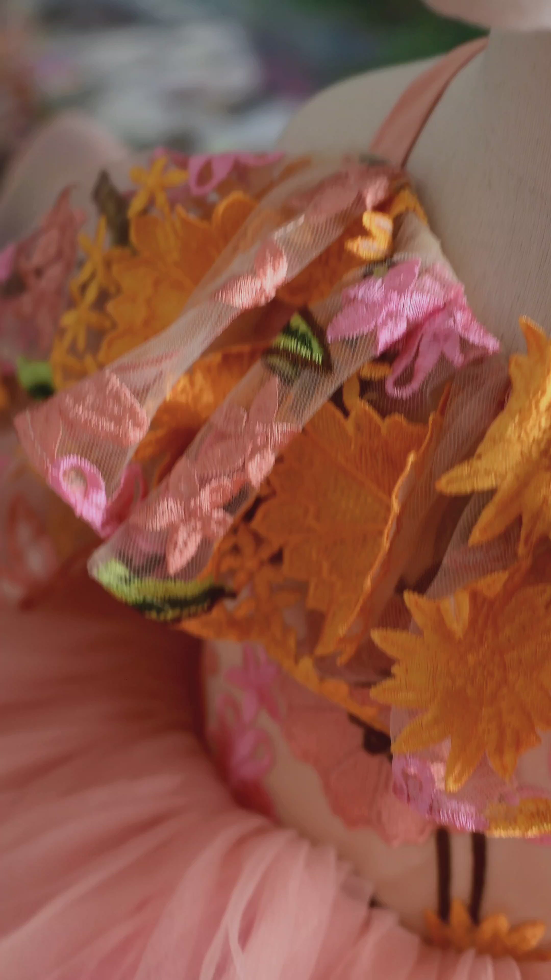 Treat your gown with the same care and love that went into creating it. Always handle with clean hands and store in a breathable garment bag when not in use- if possible. Lightly steam or hang to release any wrinkles before your session — avoid using high heat directly on delicate tulle or lace.